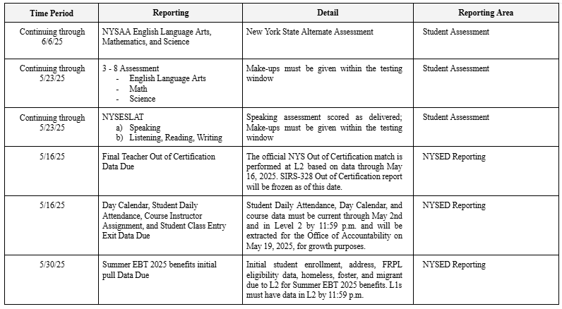 Below, significant New York State student assessment dates.