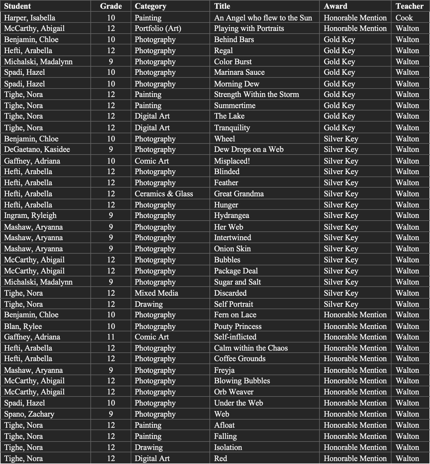 “I am so incredibly proud of the hard work and perseverance our students have shown this year, and their efforts have more than paid off,” said Stacey Walton, an art teacher at Pulaski. “We had so many amazing entries this year overall and had extremely successful results!”