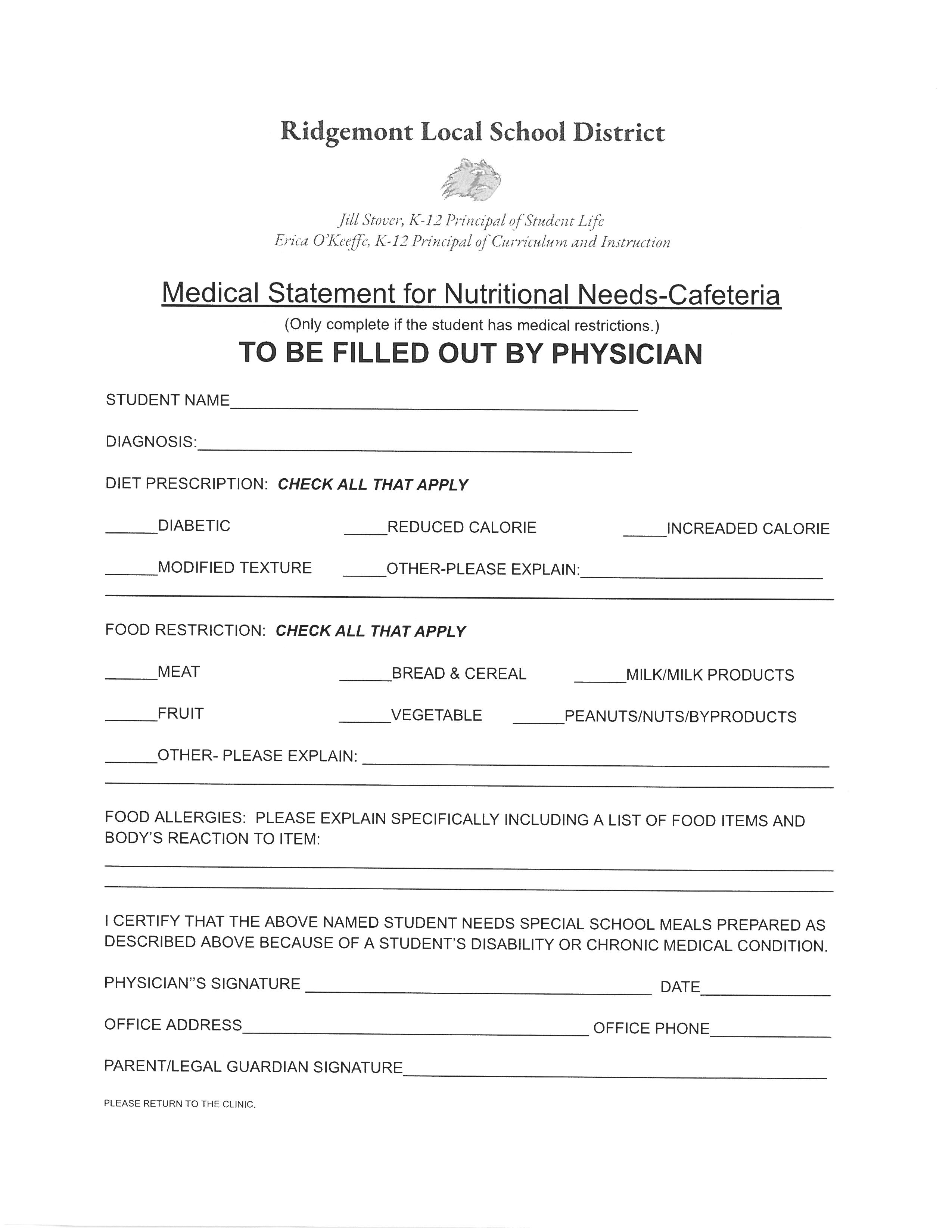Medical Statement for Nutritional Needs-Cafeteria Form