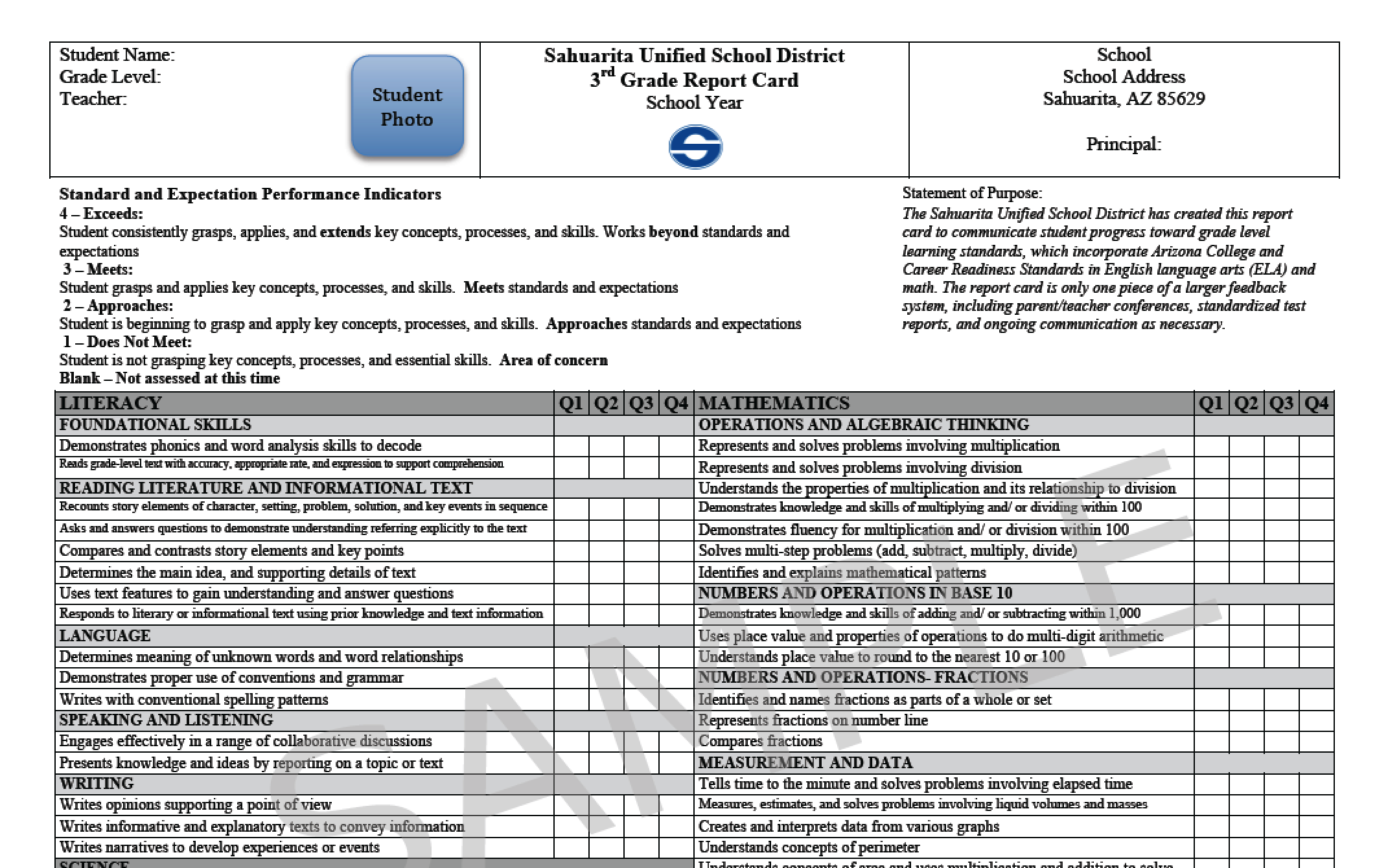 Sahuarita Unified School District provides a Standards-Based Report Card for all elementary (Kindergarten – 5th grade) students. A standards-based report card lists the most important skills students should learn in each subject at a particular grade level. Instead of letter grades, students receive marks that show how well they have mastered the skills. Our elementary report card represents how well a student is performing at the time of reporting. We believe this information will be meaningful to students and families.