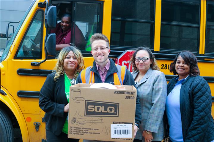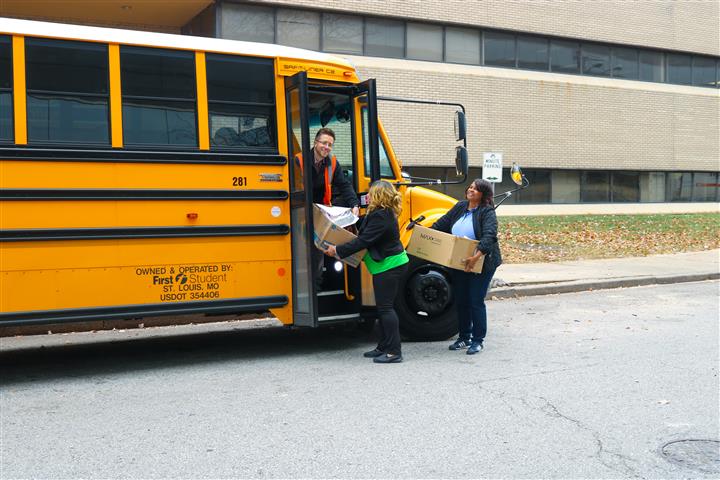 Families visited Central Office today to pick up baskets of items commonly prepared for the Thanksgiving holiday, including turkeys, macaroni and cheese, cornbread and cranberry sauce. First Student, the District’s bus transportation supplier, was on hand to pick-up and deliver baskets of food to families unable to make the trip to Central Office.