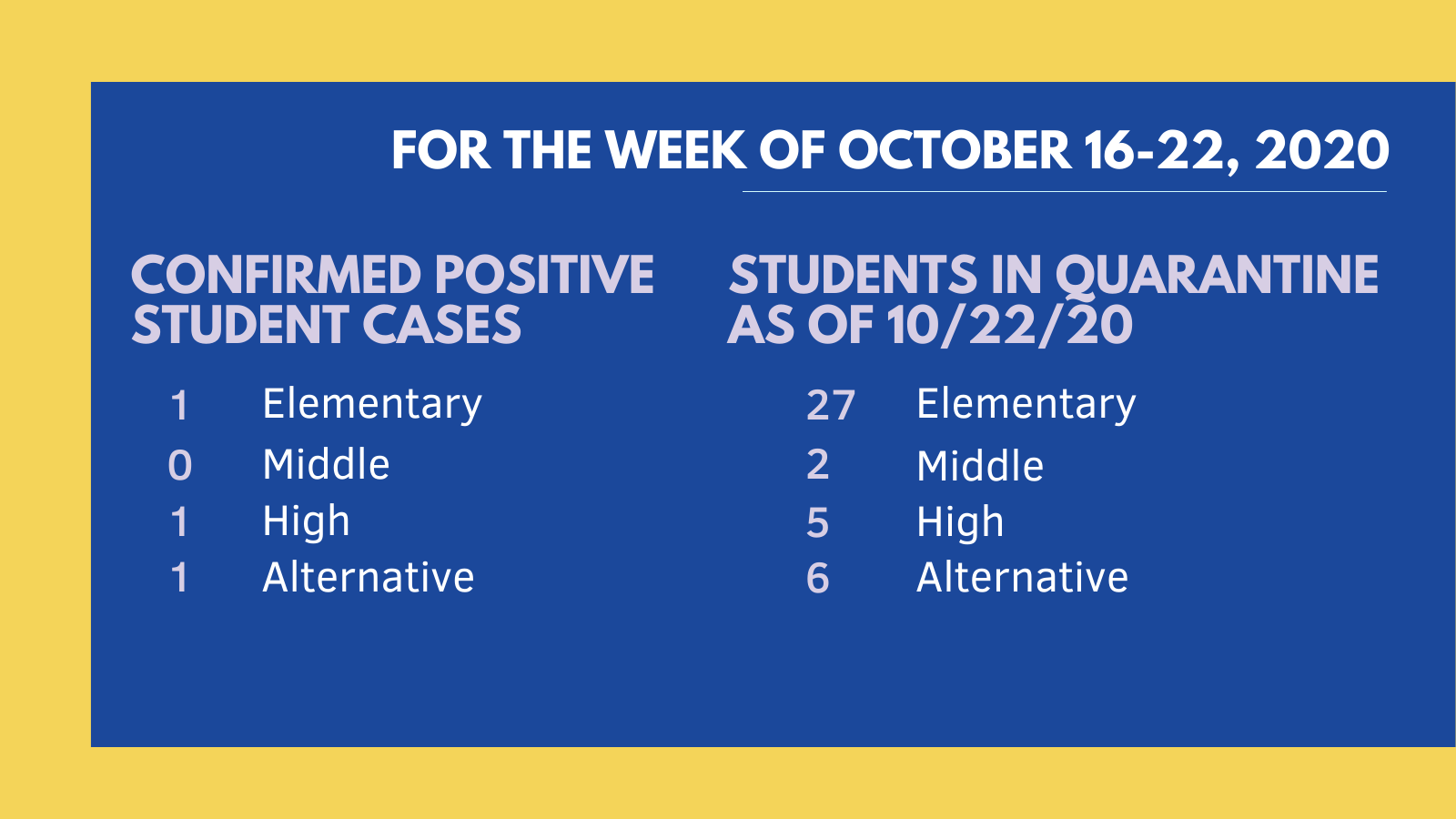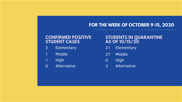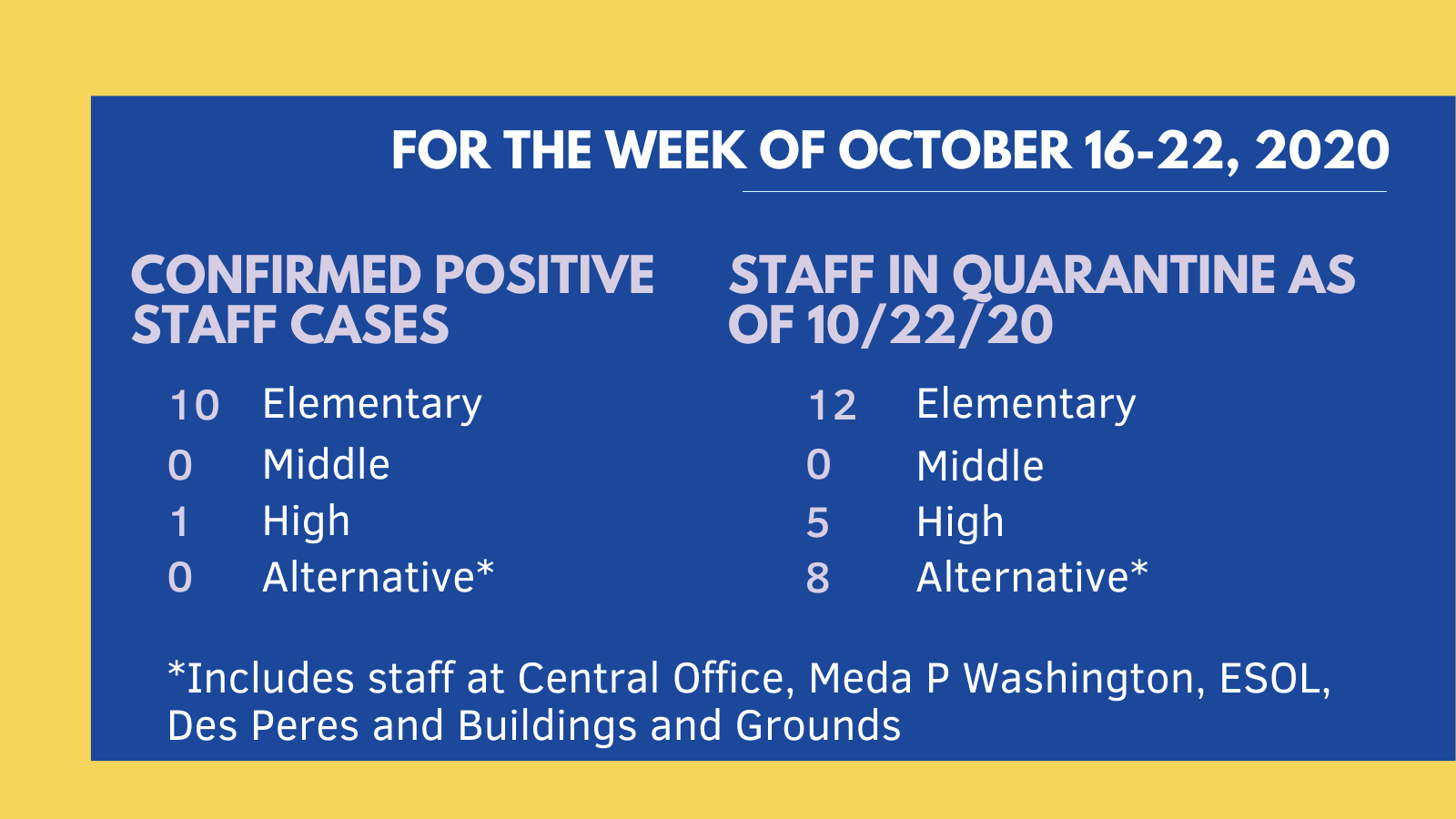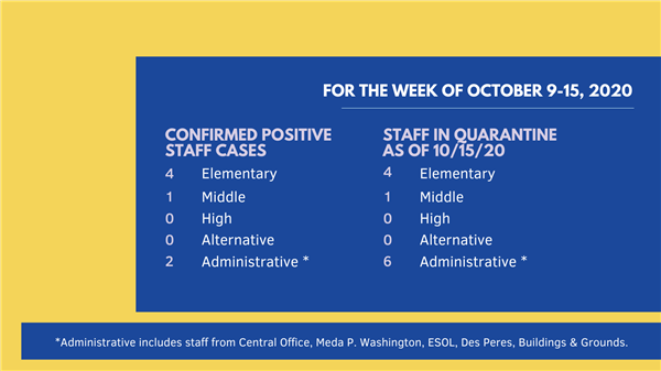 Numbers indicated are meant to provide the public with a snapshot of how COVID-19 is affecting the District community as a whole. As such, quarantine numbers indicated include all staff/students subject to any voluntary or mandatory quarantine due to an exposure, regardless of where such exposure occurred. When available, the District will also supply information on how many of those quarantines are due to school/office contact. Those individuals subject to a quarantine will remain within the “Quarantine” tracking numbers until such time that they are no longer subject to a quarantine order.