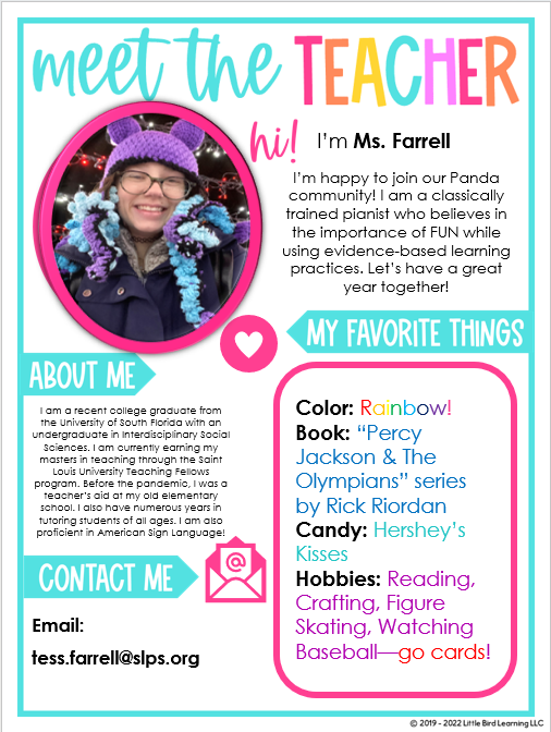 If you have any questions, please feel free to message me on Class Dojo or send me an email at tess.farrell@slps.org