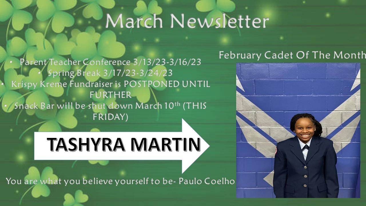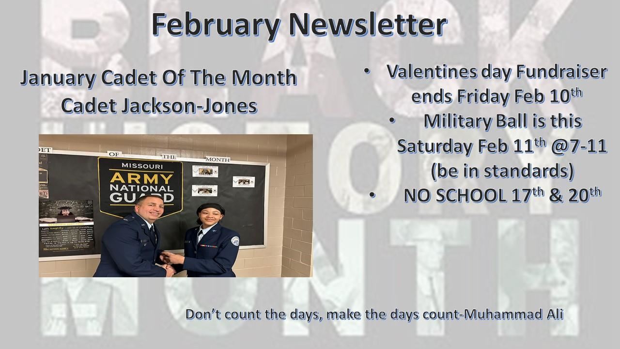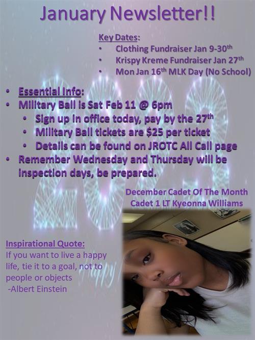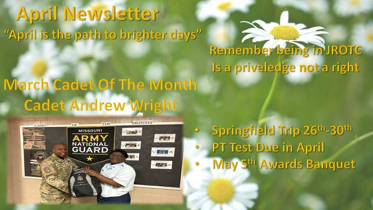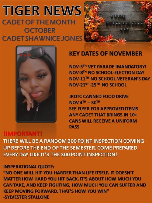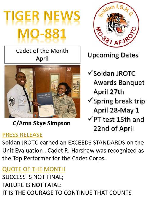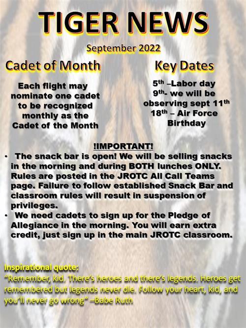 Cadets in the program design and produce a Monthly Tiger Newsletter. It lets the cadets and their families know what is happening in the program. Below you will find the most current newsletter produced by our Public Affairs Officers.