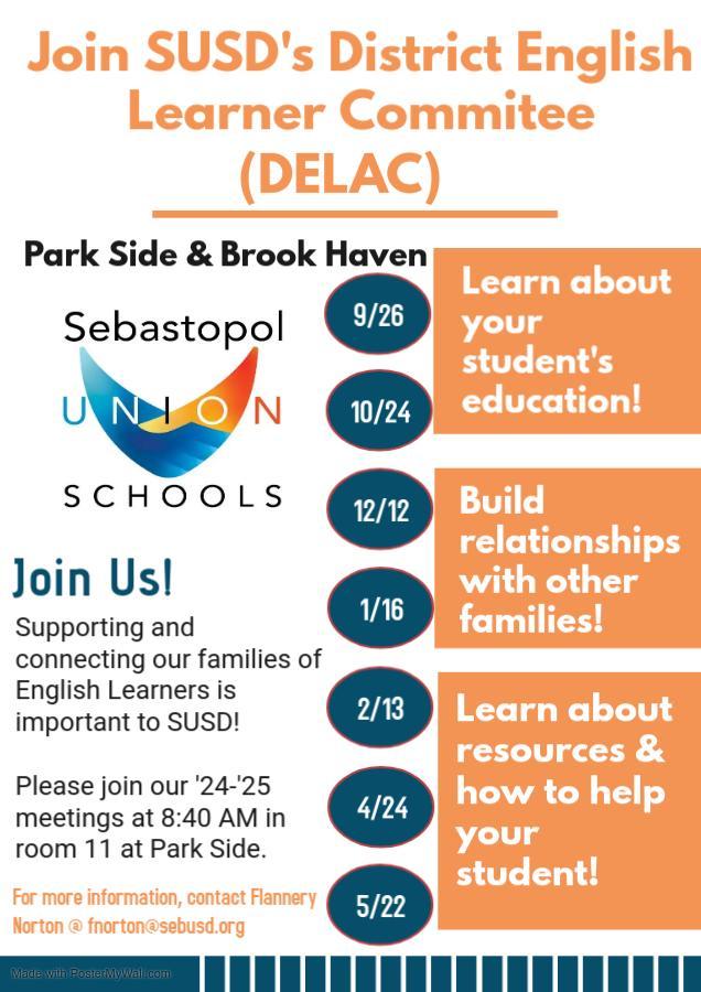 Join the district DELAC Committee! Please join us for our first meeting of the year on September 26th at 8:40am in Room 11 at Park Side.
