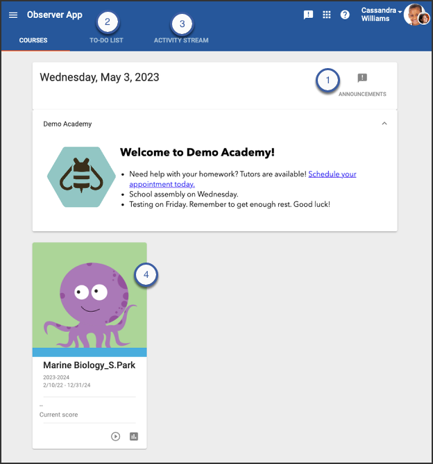 The Observer landing page gives you a good overview of what's happening in all of the student's current courses.