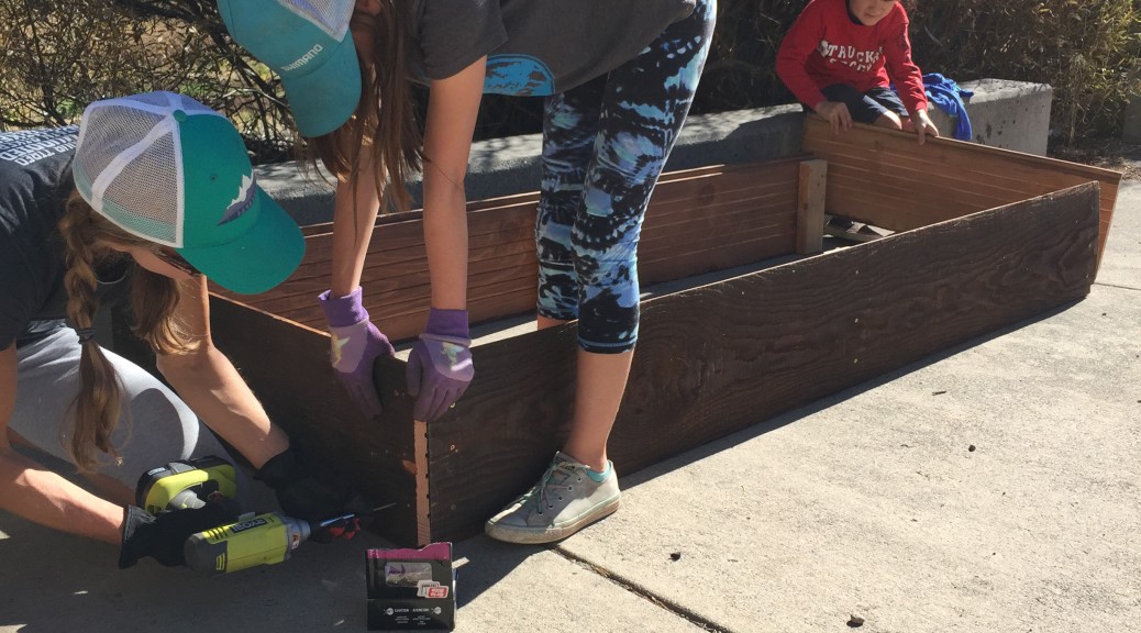 Another priority in the SELS garden location, like almost any other spot in Truckee, is dealing with the poor native soil. Tahoe soil could have lots of shale, granite, and crushed pine needles. As my neighbor once said, ‘It’s a bunch of rocks with some crushed pine needles holding it together.” A great way to deal with this is to NOT deal with it, and just put raised beds on top filled with healthy, nutrient-rich soil. After reaching out, Seamus Gallagher and Gallagher Construction very willingly donated a number of cedar boards that we used for the box portion of the raised bed. With help from Brent and Jason, we cut and staged the boards for 5 raised beds.
