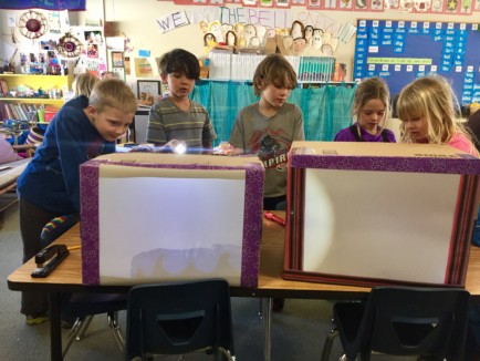 The Bell Crew is wrapping up a mini-expedition exploring the connection between light and sound vibration as well as investigating the path of a beam of light. Students have spent the past several weeks working as scientists to observe, wonder and record their findings about light and sound. They have used mirrors to bend light, tested out materials in light boxes to determine their transparency, and made numerous discoveries about the nature of sound vibrations. Currently, they are working in engineering teams to tell a story using light and sound. In their groups, they are learning the design process that professional engineers rely upon daily — brainstorm, design, build, test, redesign, build, test… They are thrilled to be active scientists and engineers!
