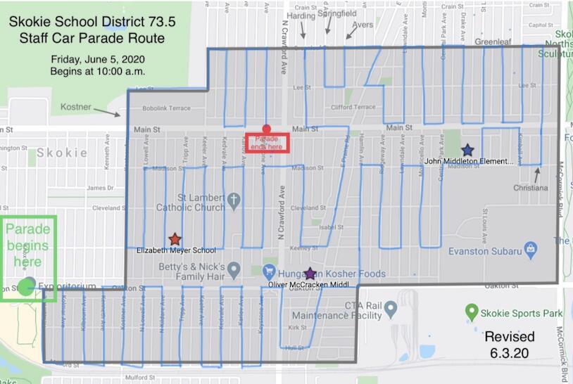 The June 5th District Staff Car Parade route has been revised due to construction on streets east of Crawford and south of Oakton. Please check the updated map BELOW for the new route.