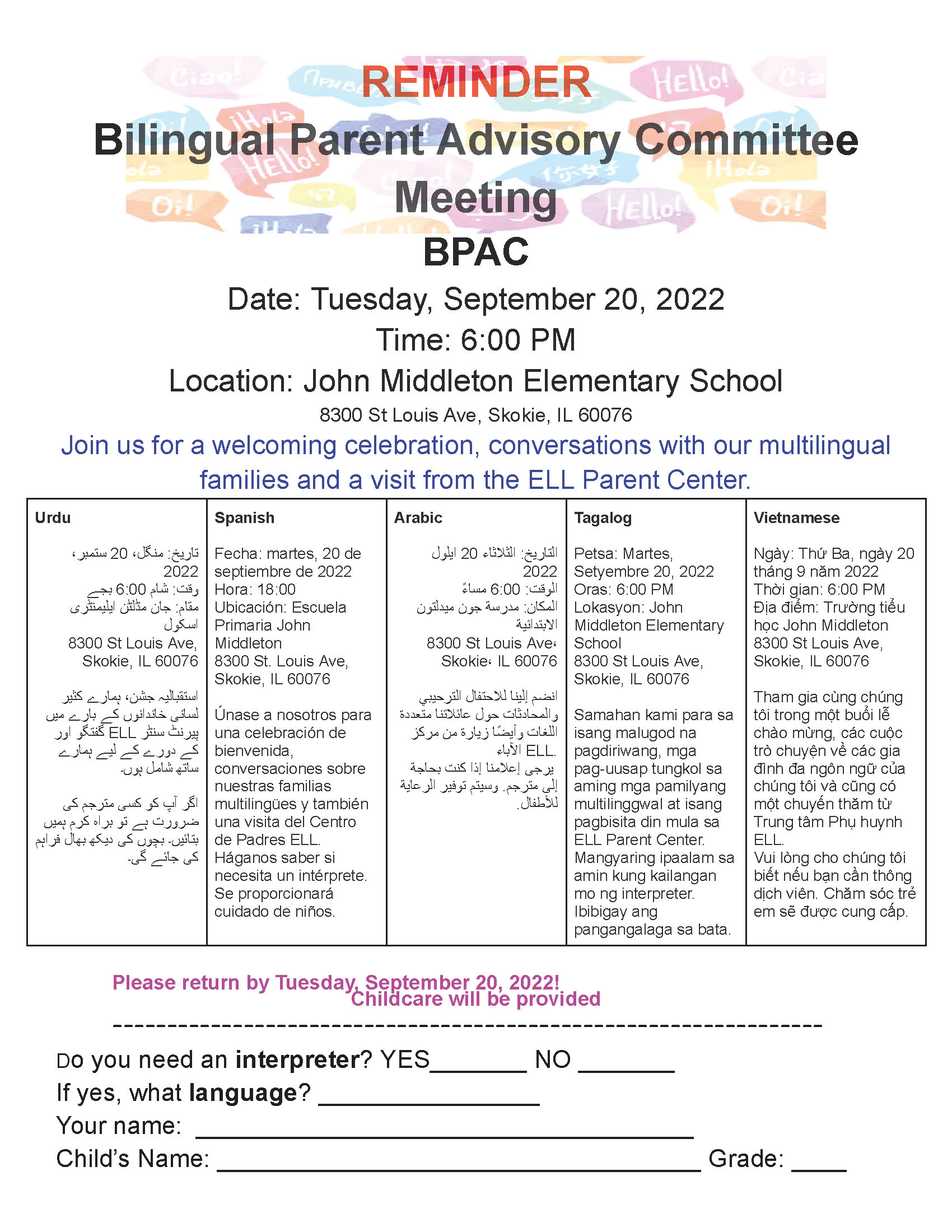 Join us for a welcoming celebration, conversations with our multilingual families, and a visit from the ELL Parent Center.