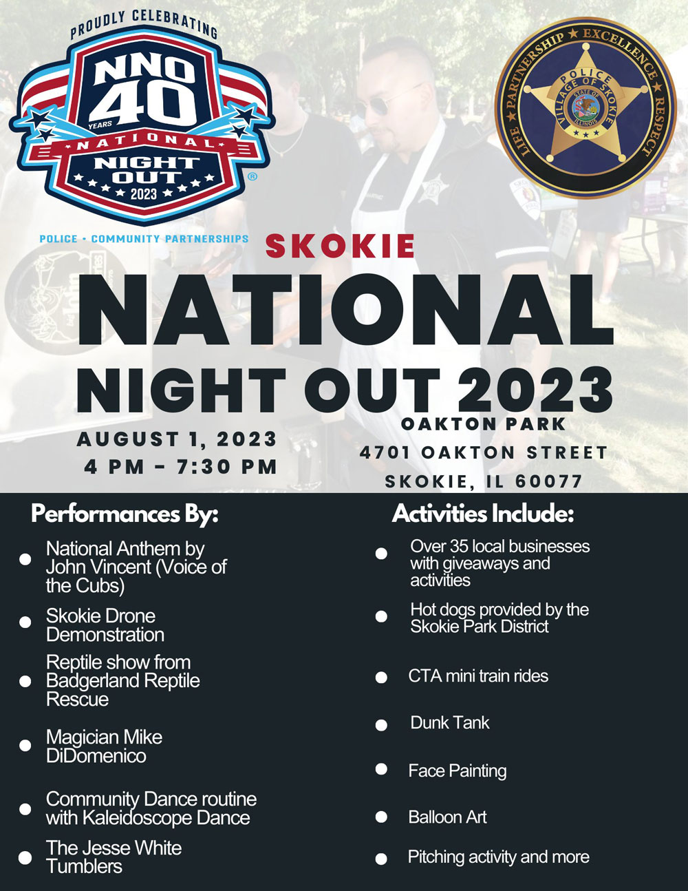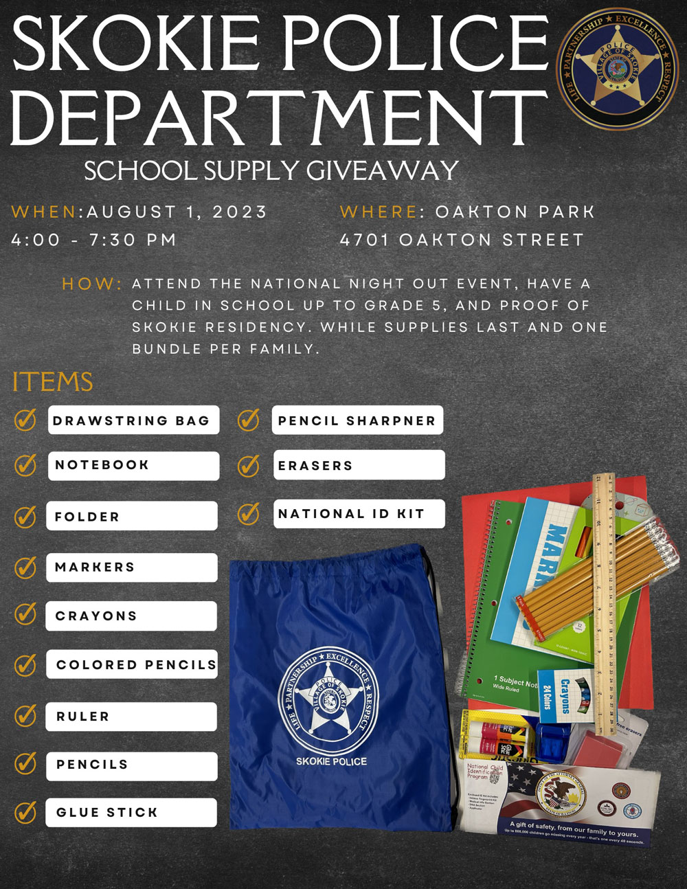 Need school supplies? Stop by the National Night Out on August 1st and say "hello" to our Skokie Police Department! They're giving away school supply bundles to Skokie residents who have a child in school up through 5th grade. Check the flyers for more information about National Night Out and the giveaway!