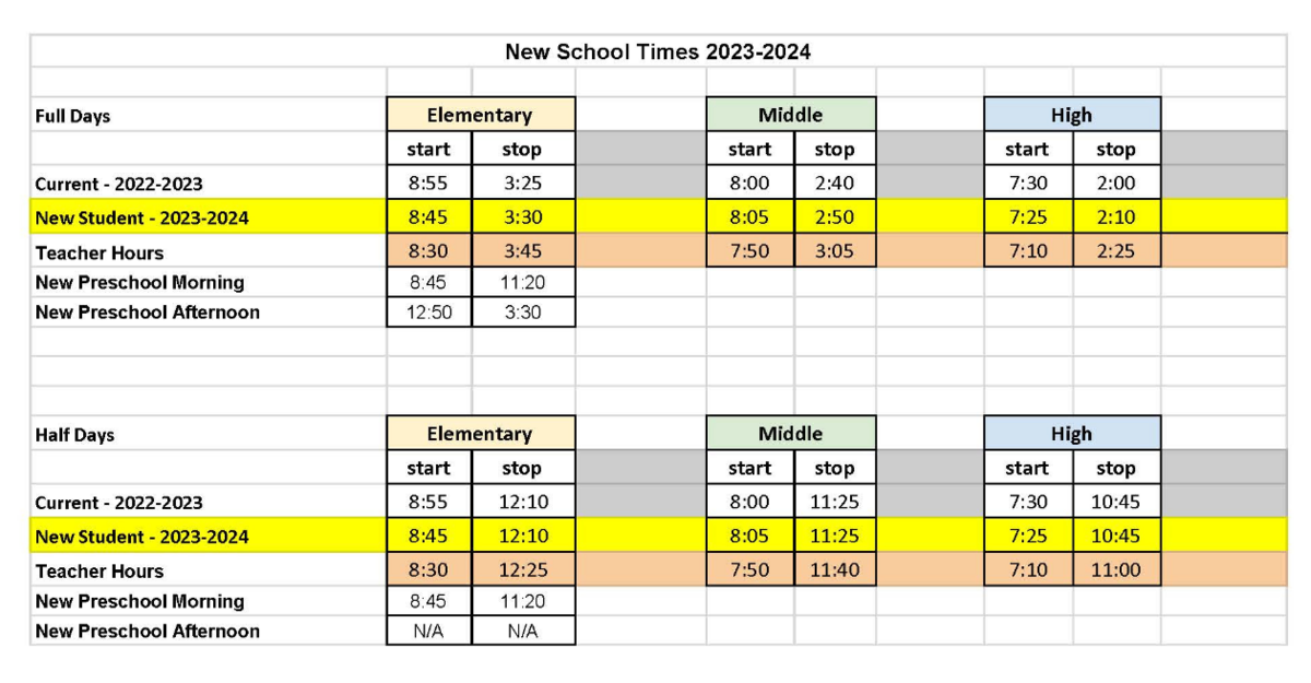 The school day schedule for the upcoming 2023-2024 school year will be changing! The new schedule for each level is listed below. This change is being made in order to better accommodate the needs of our students and reflects changes in the new teacher’s contact.