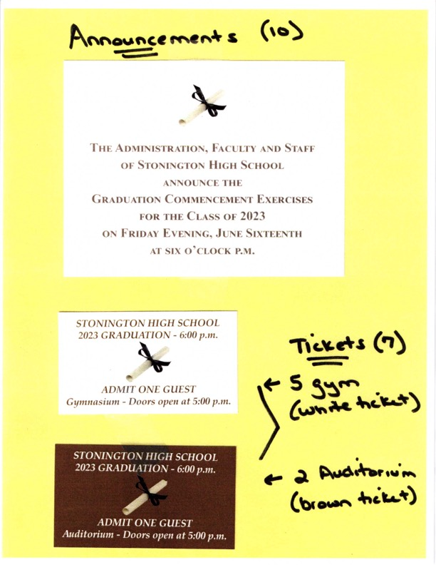 Senior Parents: Your senior will be receiving Graduation Announcements (10). They are not tickets!! They are announcements to send to family/friends announcing your child’s graduation ceremony information. The tickets will be distributed during their June rehearsal. They will receive 7 tickets (5-gym and 2-auditorium). Tickets are only needed in case the graduation is held indoors. See attached: