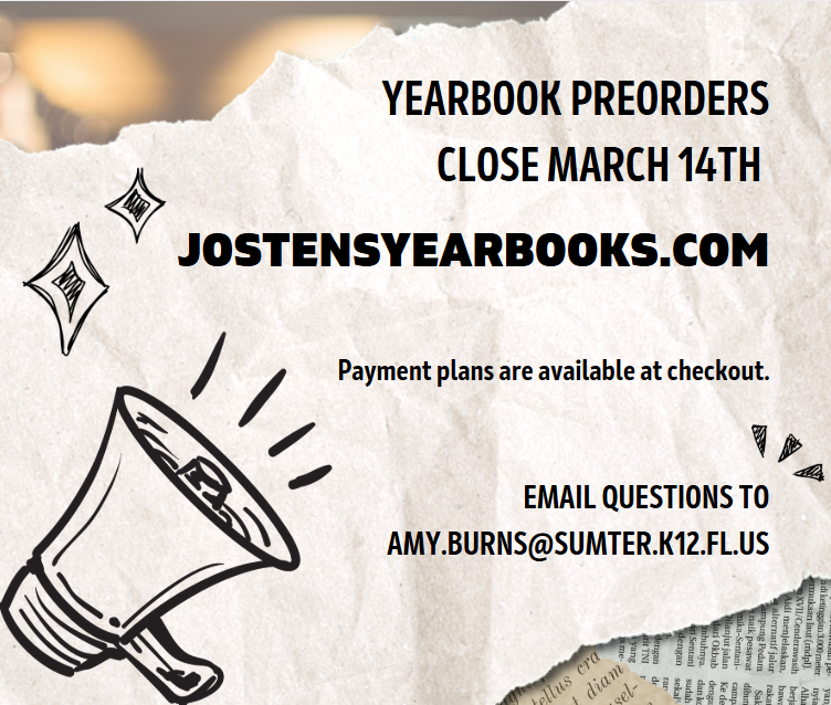 Yearbooks can be purchased at jostensyearbooks.com. Preorders close March 14th. Email questions to Amy.Burns@sumter.k12.fl.us
