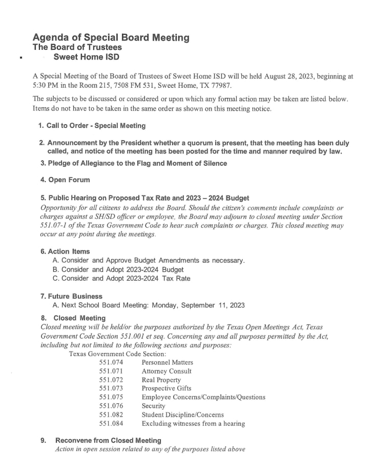 - August 26, 2024 @ 5:30 p.m. - Special Board Meeting NOTICE