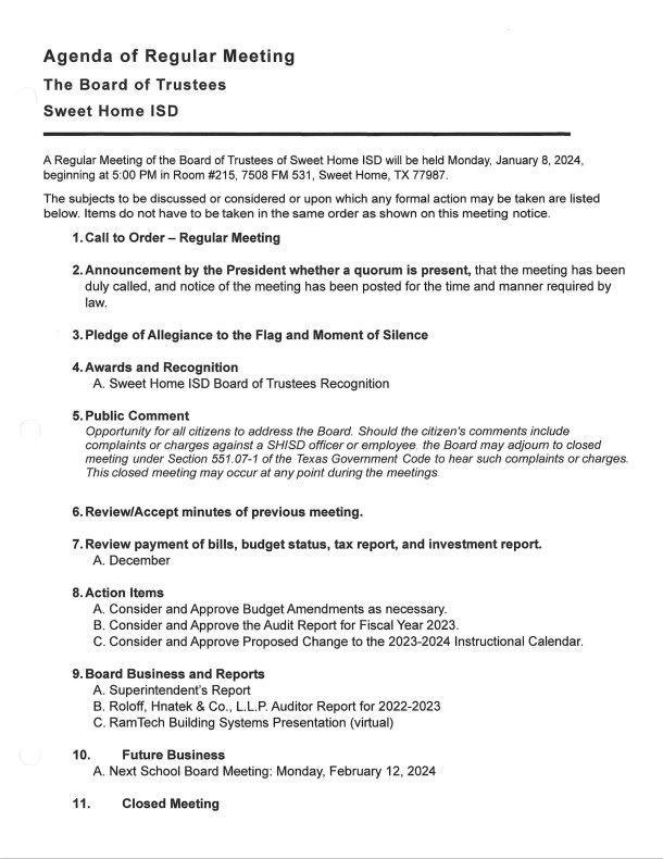 - January, 8, 2024 - Regular Monthly School Board Meeting