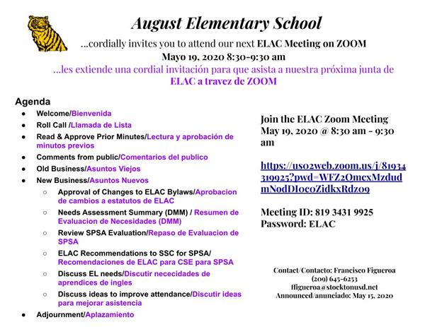 As stipulated by educational codes, whenever twenty-one or more ELs are enrolled at a school site, the site establishes a funcitoning English Learner Advisory Committee (ELAC) that advises the school on program and services for English learners. The committee is comprised of parents, with parents of English learners making up the majority of members. August parents of English learners are represened in at leaset the same percentage of the EL student enrollment at the school site. ELAC officers are voted into their roles and serve terms as dictated by our August ELAC Bylaws.