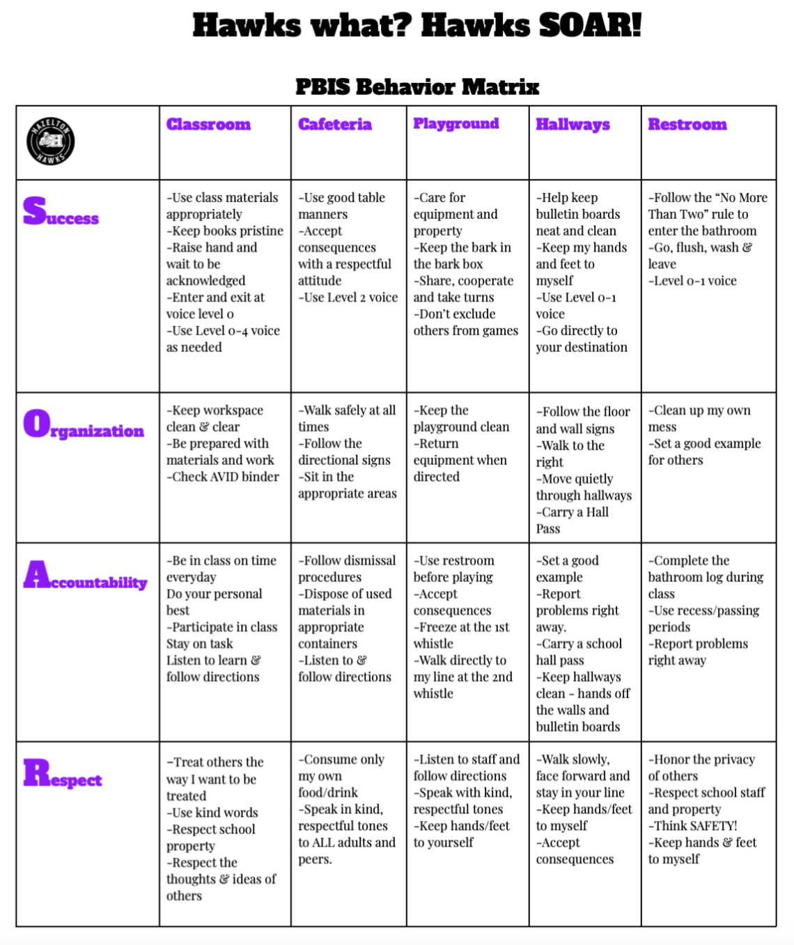 At Hazelton we have created a school-wide matrix dedicated to specifically define expected behaviors on certain parts of the campus. The four areas we have selected are: Playground, Cafeteria, Common Areas and Classrooms. In each of these areas we look to teach students to be Successful, Organized, Accountable, & Respectful (S.O.A.R.). These four attributes give students, teachers, administrators, and parents a common language in interacting with one another. As a result, this language helps all educational partners build a more cohesive, collaborative and caring community. In the end, our hope is that it leads to a meaningful and positive future.