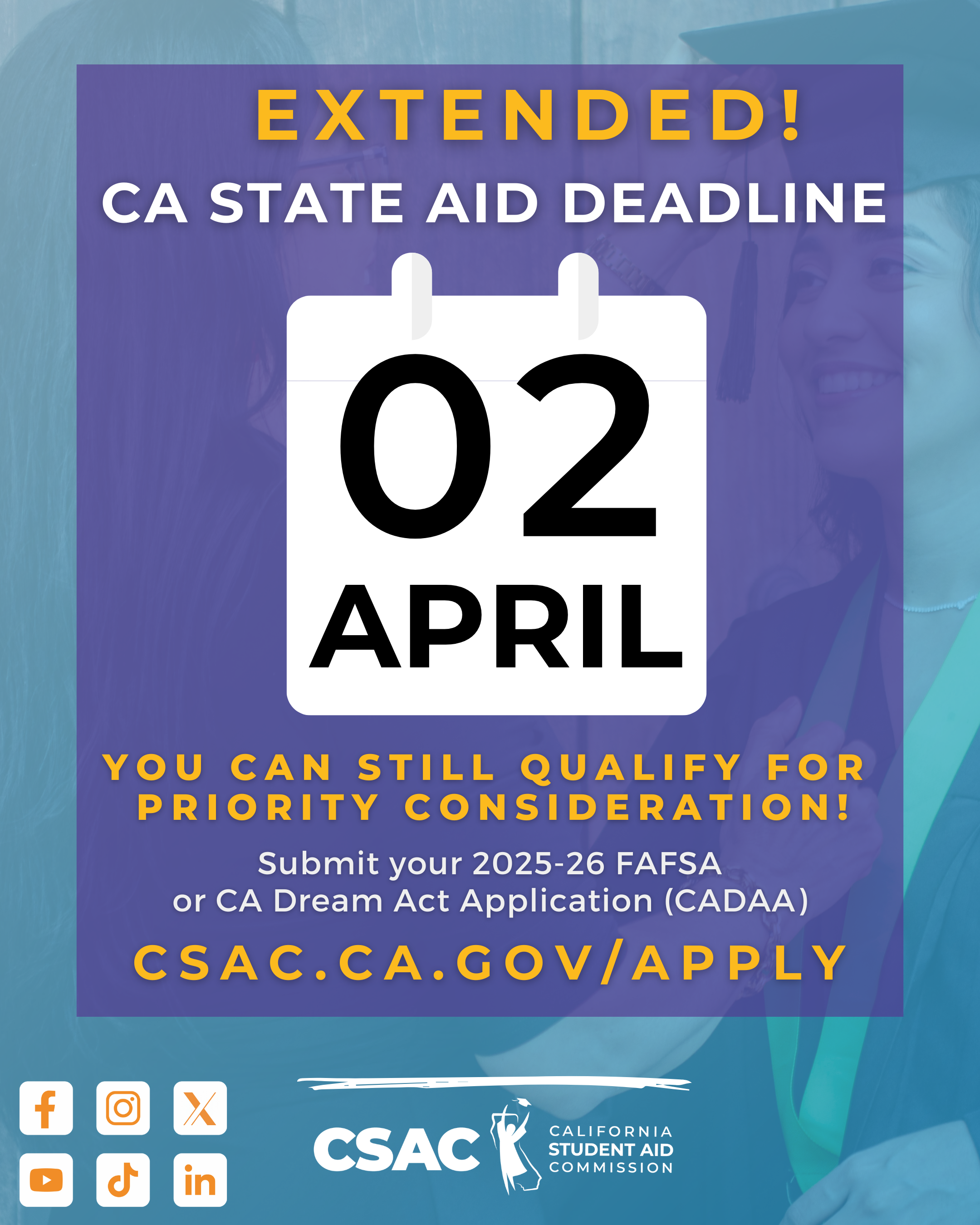 All SUSD 12th graders can (and should) apply for financial aid! In order to qualify for aid, students must complete the California Dream Act Application or the FAFSA (Free Application for Federal Student Aid). For more information, contact your school counselor.