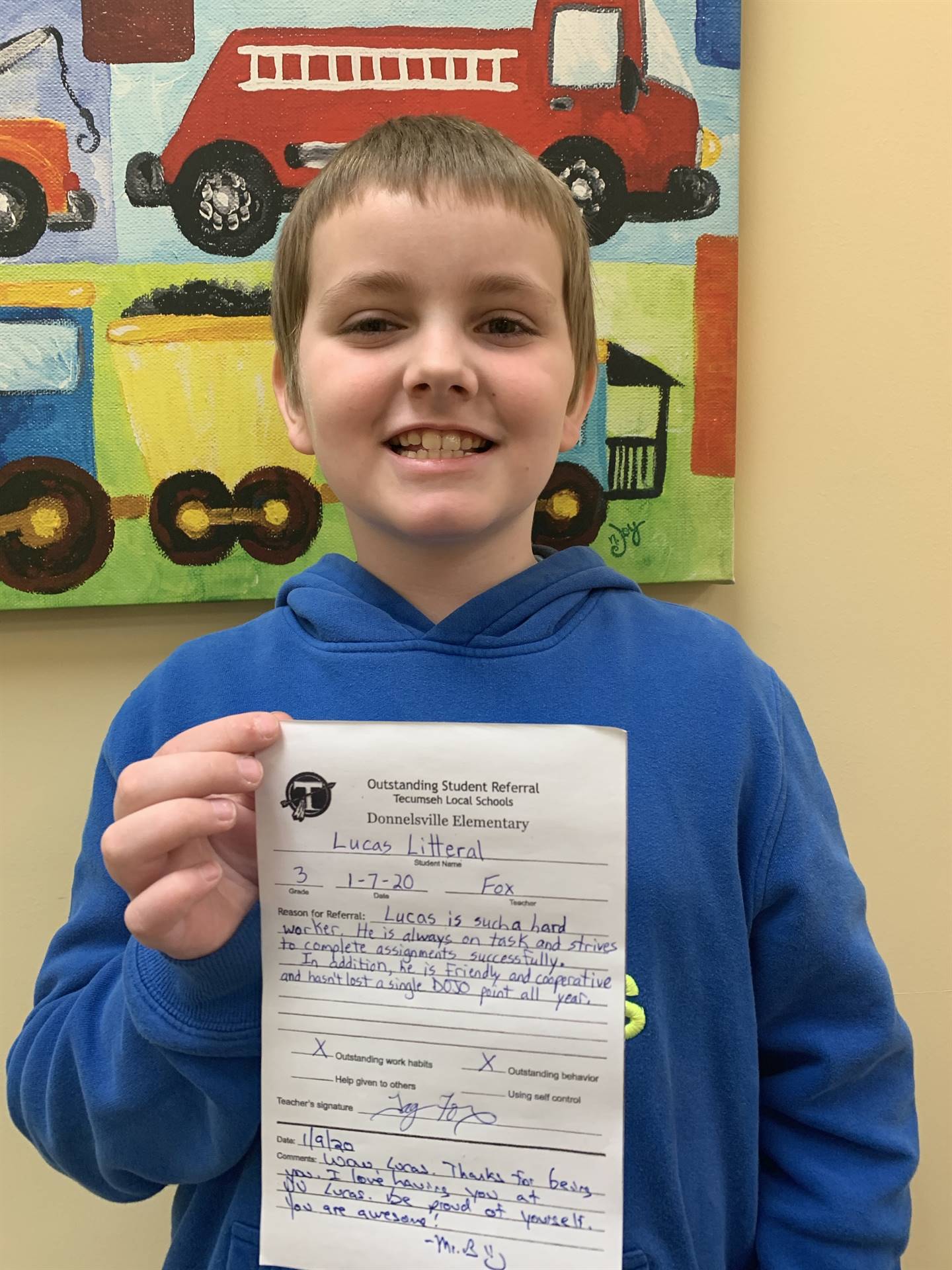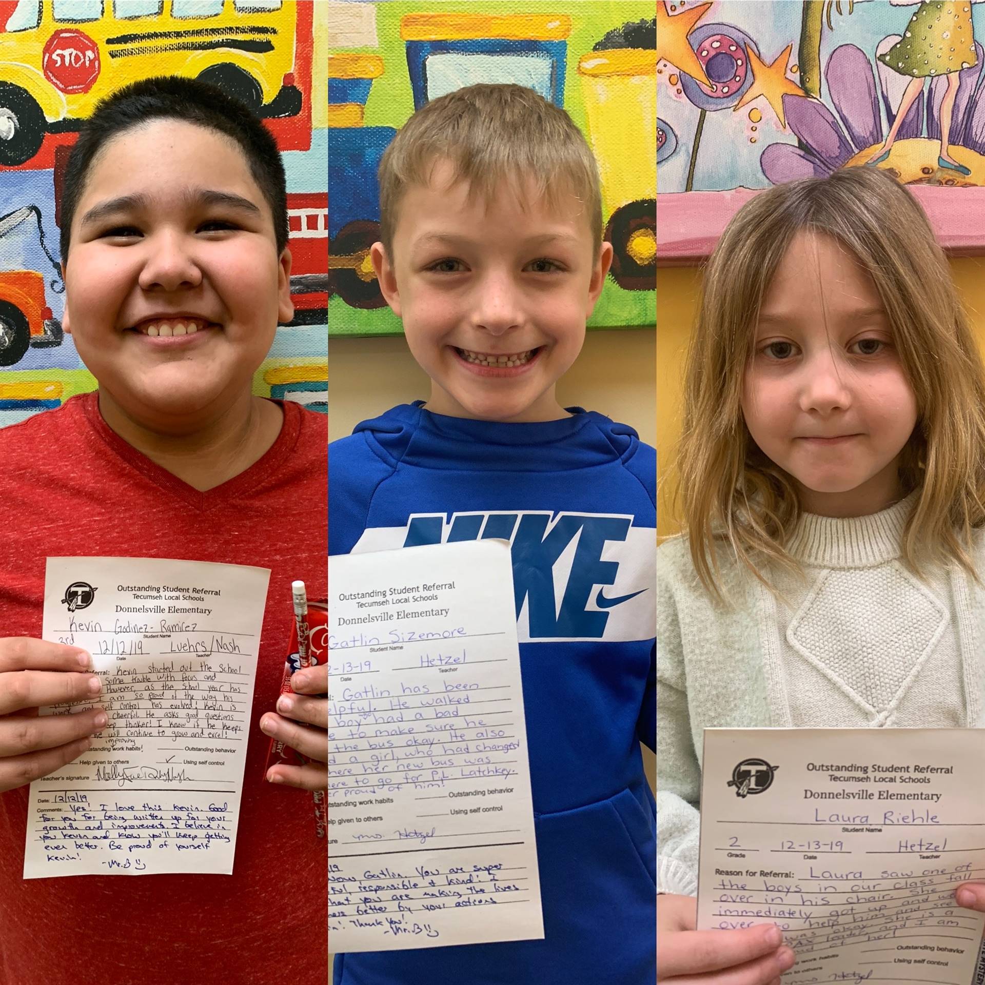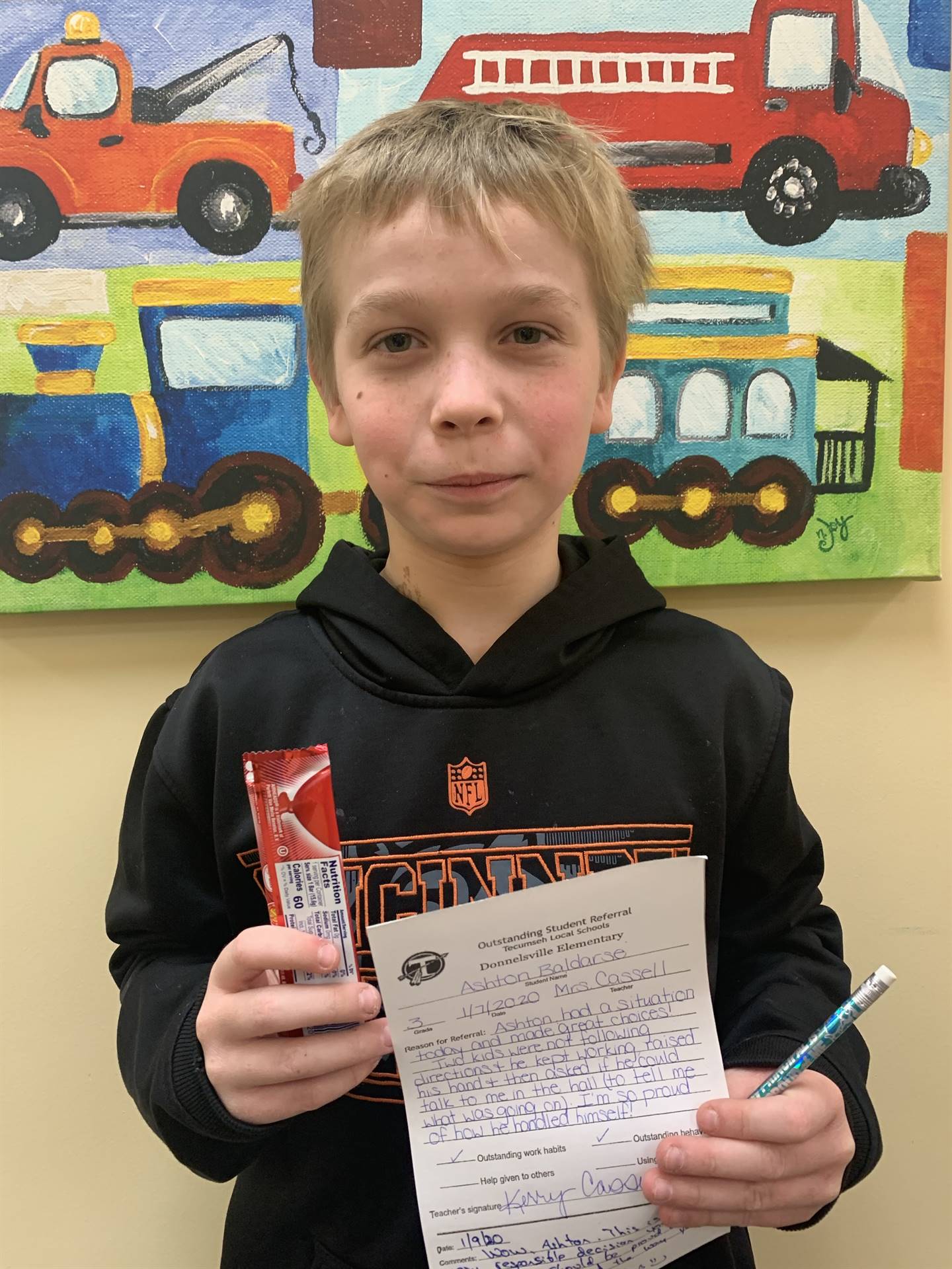 You may receive a letter from Donnelsville Elementary with a note that was written by a staff member about your child. This is our Positive Office Referral Program. Last school over 500 of these letters went home to parents. This is our way, as a staff, of recognizing kids who are doing great things. The teachers fill out these forms, I call the students to my office and we then discuss why they were written up. You should see the smiles on their faces. It is really one of the best parts of my day. We then take their picture and they are given some special treats from me. If you have been in our building, you have seen the hundreds of student pictures hanging in the hall. We love to recognize as many kids as we can here at Donnelsville for doing a good job!!!