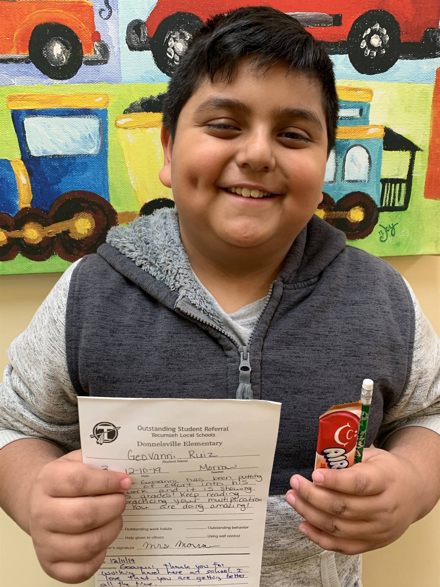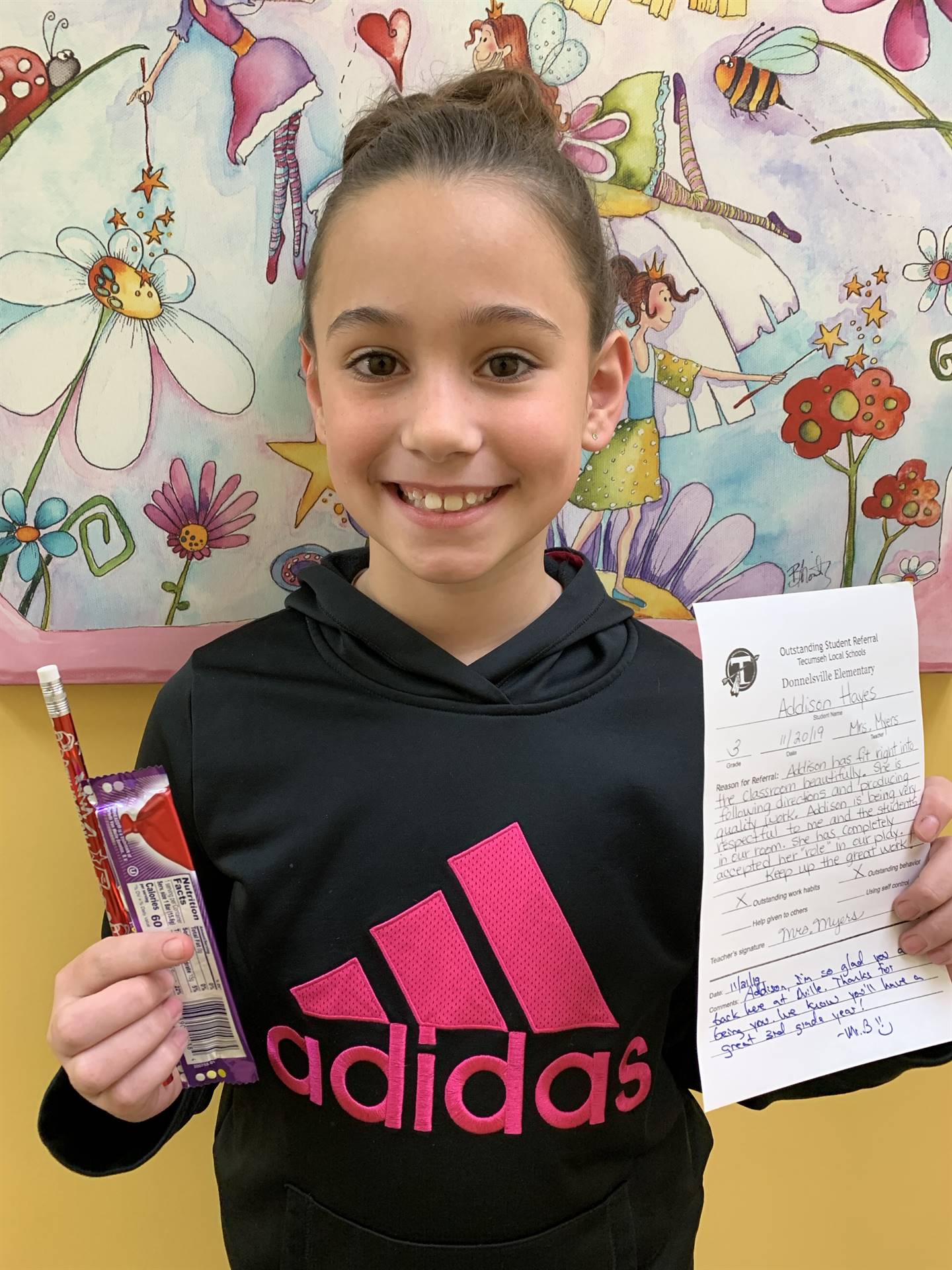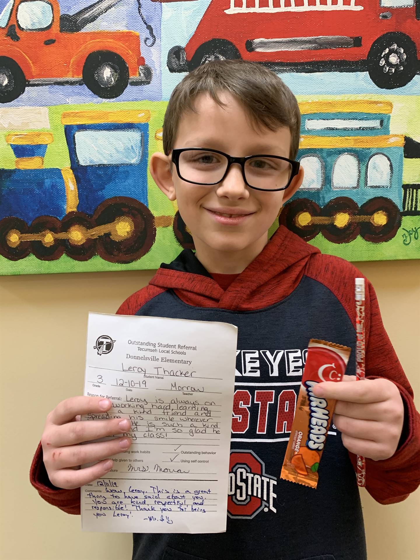 You may receive a letter from Donnelsville Elementary with a note that was written by a staff member about your child. This is our Positive Office Referral Program. Last school over 500 of these letters went home to parents. This is our way, as a staff, of recognizing kids who are doing great things. The teachers fill out these forms, I call the students to my office and we then discuss why they were written up. You should see the smiles on their faces. It is really one of the best parts of my day. We then take their picture and they are given some special treats from me. If you have been in our building, you have seen the hundreds of student pictures hanging in the hall. We love to recognize as many kids as we can here at Donnelsville for doing a good job!!!