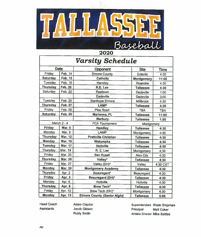 The Tallassee High School baseball team will kick off their season on February 14th. See attached schedule