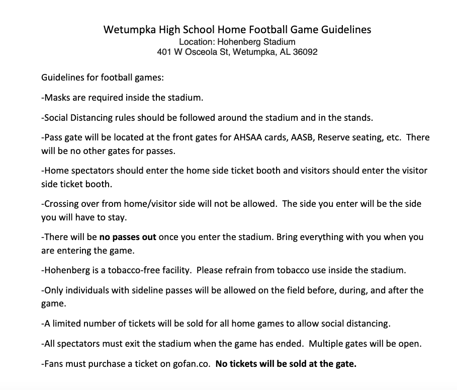 All tickets for our football game against Wetumpka this Friday will be sold online at GoFan.com. All tickets are $10. We are only allocated 800 tickets (excluding band, cheer, and dance) so get your tickets ASAP! Do not validate the ticket until you get to the gate at Hohenburg stadium. Wetumpka gate workers will validate your ticket. Fans will enter the stadium at the front gate on the left hand side. More information coming this week about stadium procedures, but masks must be worn. AHSAA sent a very heavily toned email on Friday regarding the lack of compliance at Thursday night's events around the state... Let's do our part to keep our students playing and performing!