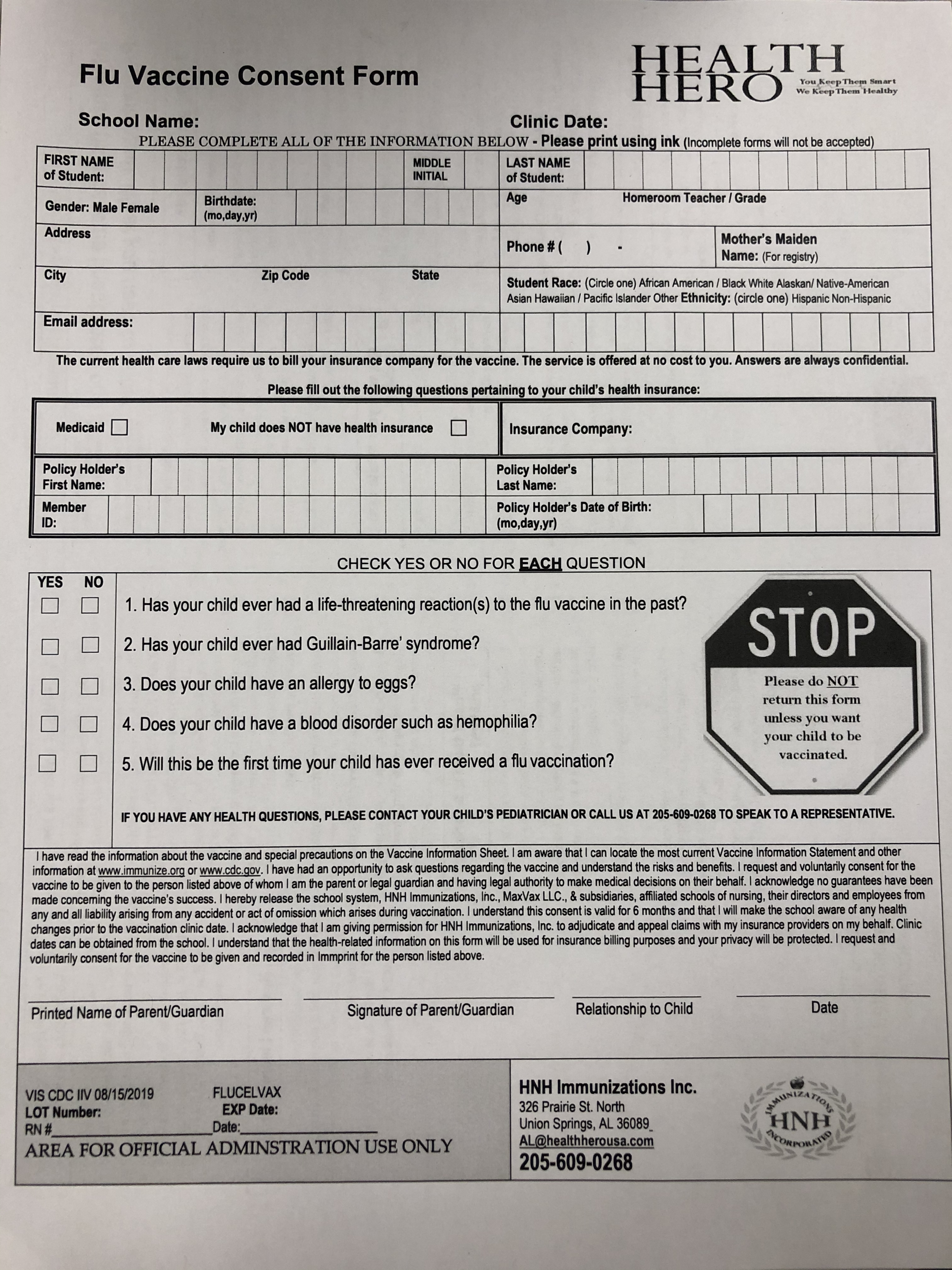 HNH Flu Clinic for students will be November 6th at all school locations. Flu shots are FREE but you must complete a permission form. Permission forms are due back no later than Wednesday November 4th. Forms need to be turned in to the School Nurse. If your child is virtual and you would like them to receive the flu vaccine, please contact the school nurse at your child's campus.