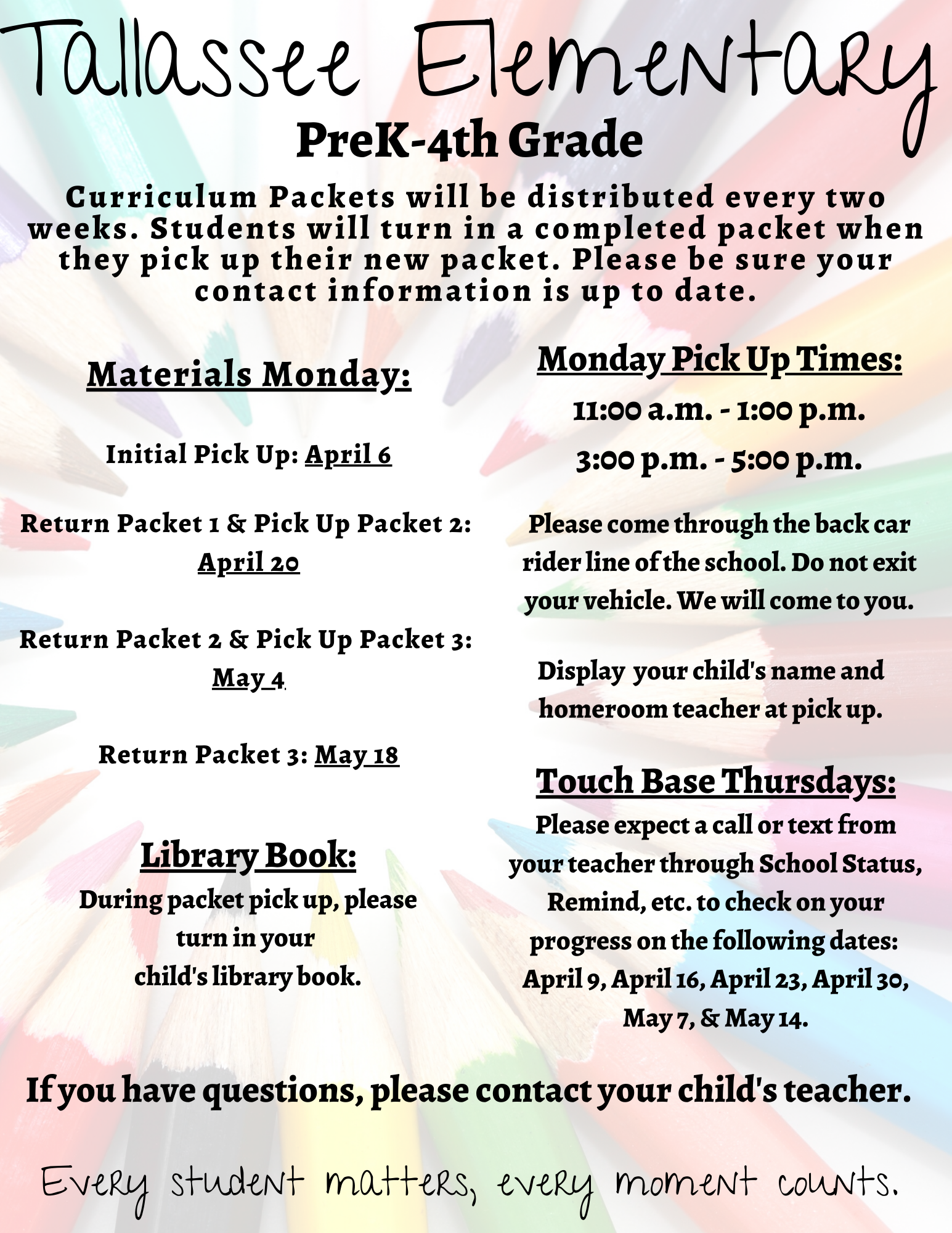 Tallassee Elementary Packet Pick Up and additional information can be found below. This pertains to our school closure from April 6th until the end of the school year. A video explaining the packet pick up process can be viewed at this link: https://drive.google.com/file/...