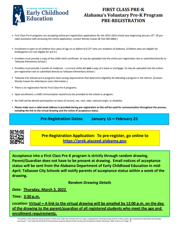 Our First Class Pre-K Registration is underway! The last day to register and turn in all paperwork is February 25th. Our drawing will be held virtually on March 3rd at 3:30 p.m. All communication, including the link to the drawing, will be sent via email, so please be sure to include a valid email address that is checked often for updates. If you have questions about the registration process, please feel free to call 334-283-5001.