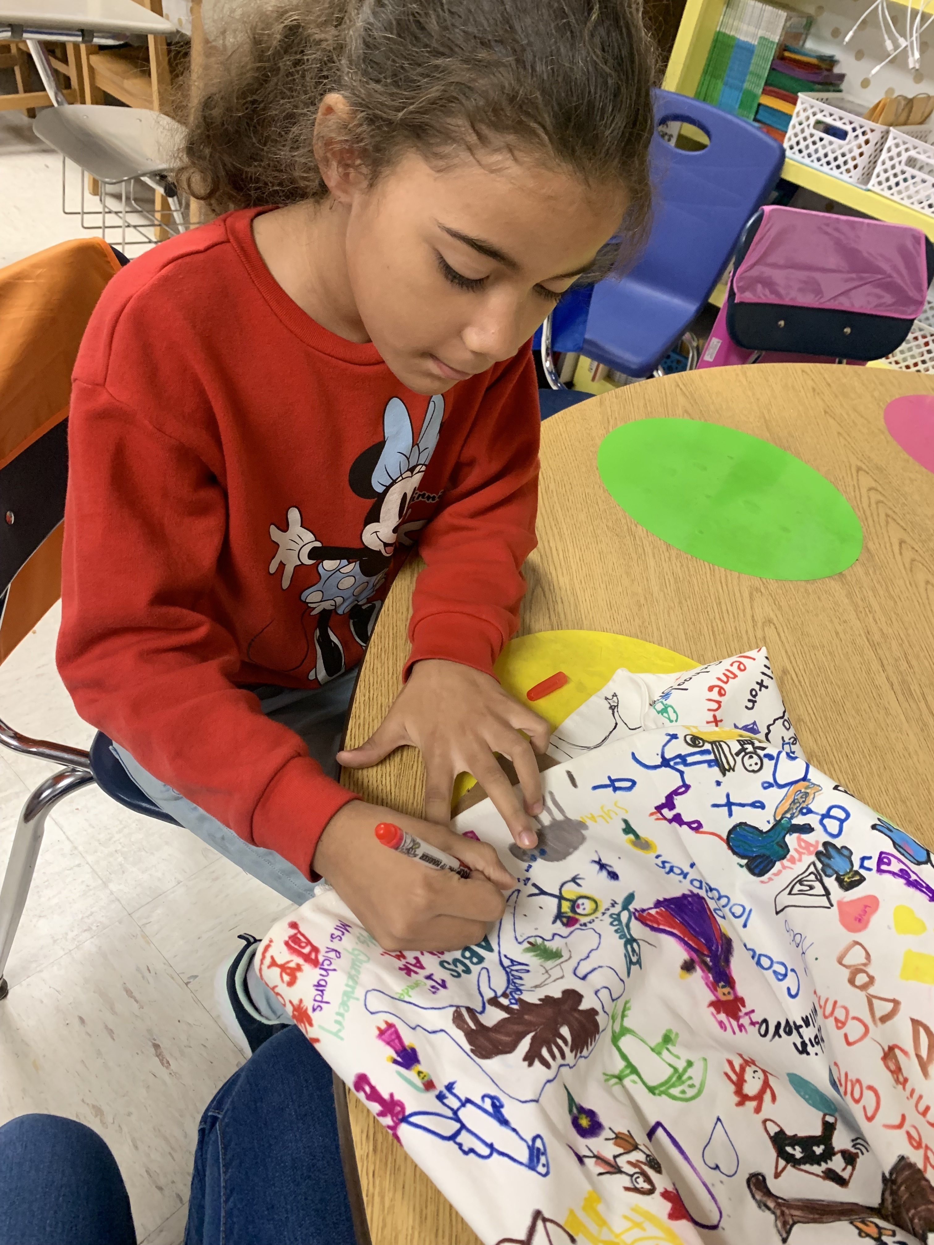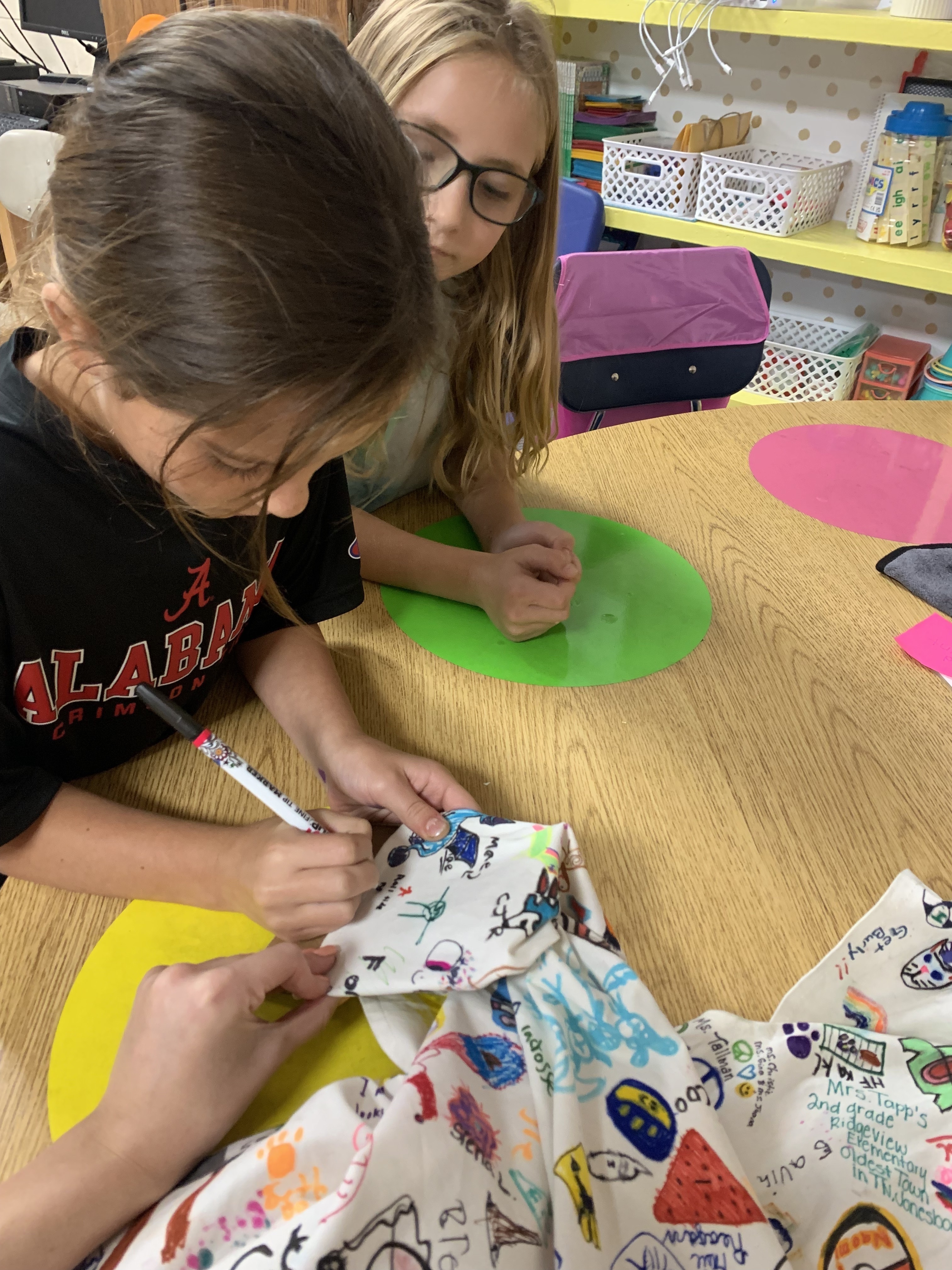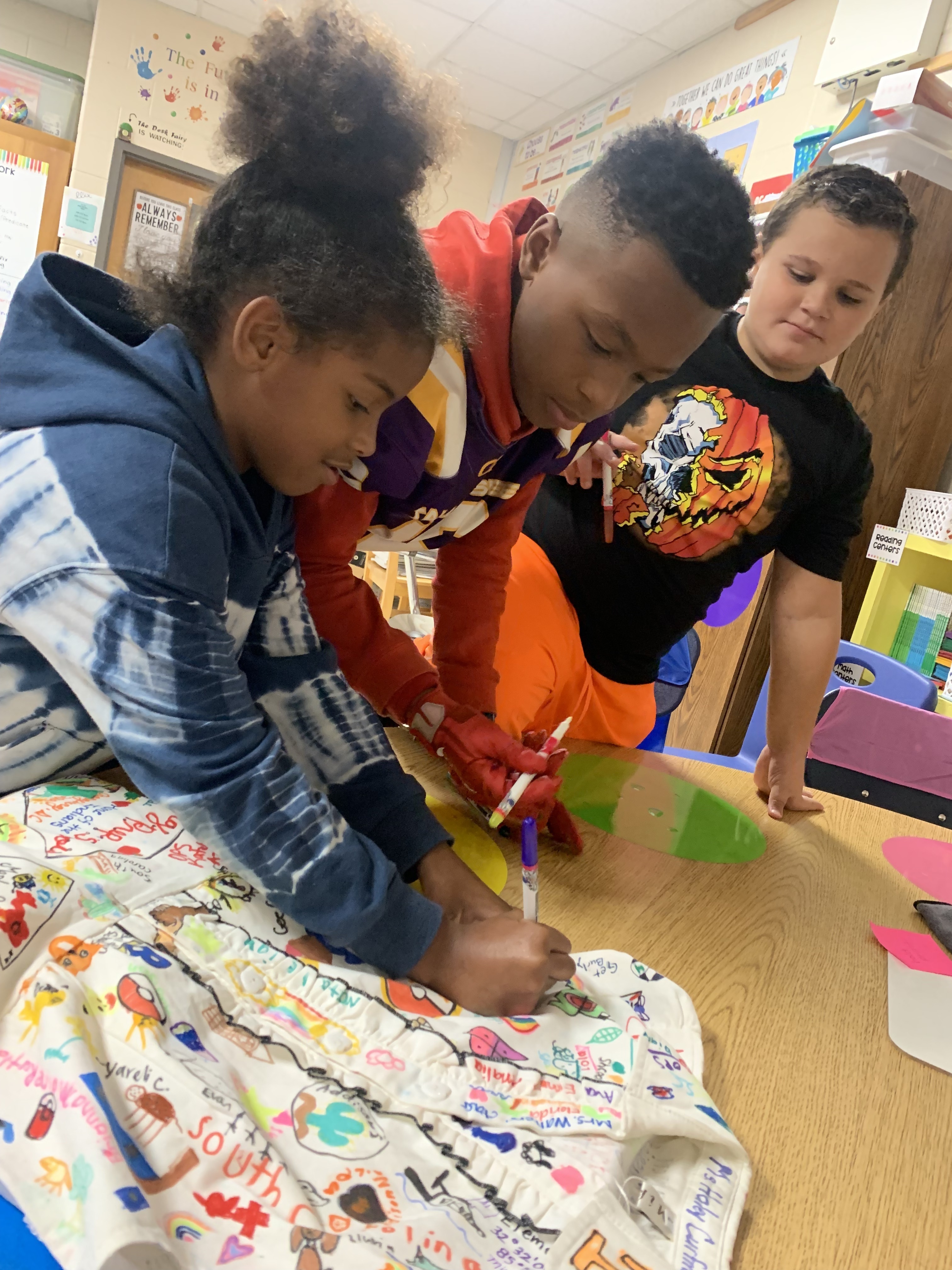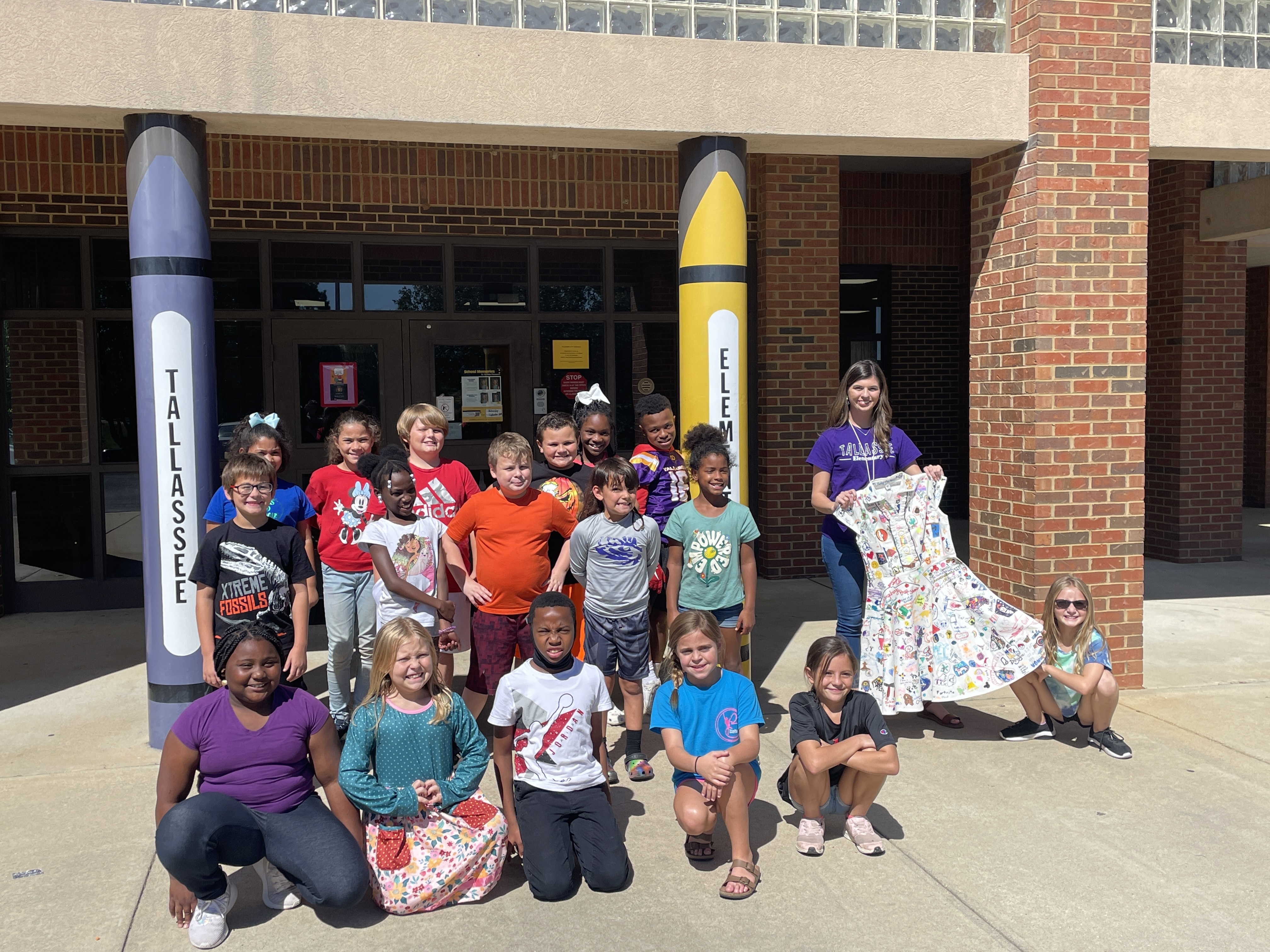 An elementary teacher from Oklahoma, Haley Curfman, began a "Kindness Project" with her class back in 2016. They purchased a white dress and decorated it with kind messages, sending it to classrooms all over the world to add their own drawings. The project was featured in articles, books, and on FOX News. However, that dress was lost overseas. Ms. Curfman's 2019-2020 class started the project over again- this time sending the dress to ONE class in each of the 50 States. Miss Hill submitted for her 3rd graders to represent Alabama, and they were chosen! The dress arrived on September 23rd. Miss Hill's students decided to leave their mark by adding the TES latitude and longitude coordinates. Students also chose a small symbol or drawing that was meaningful to them to add to the dress. They were thrilled to represent the entire state of Alabama for this project!