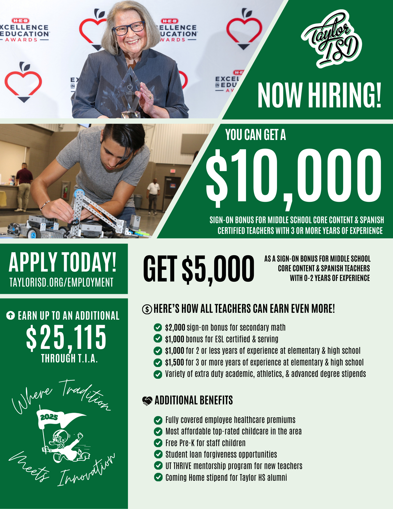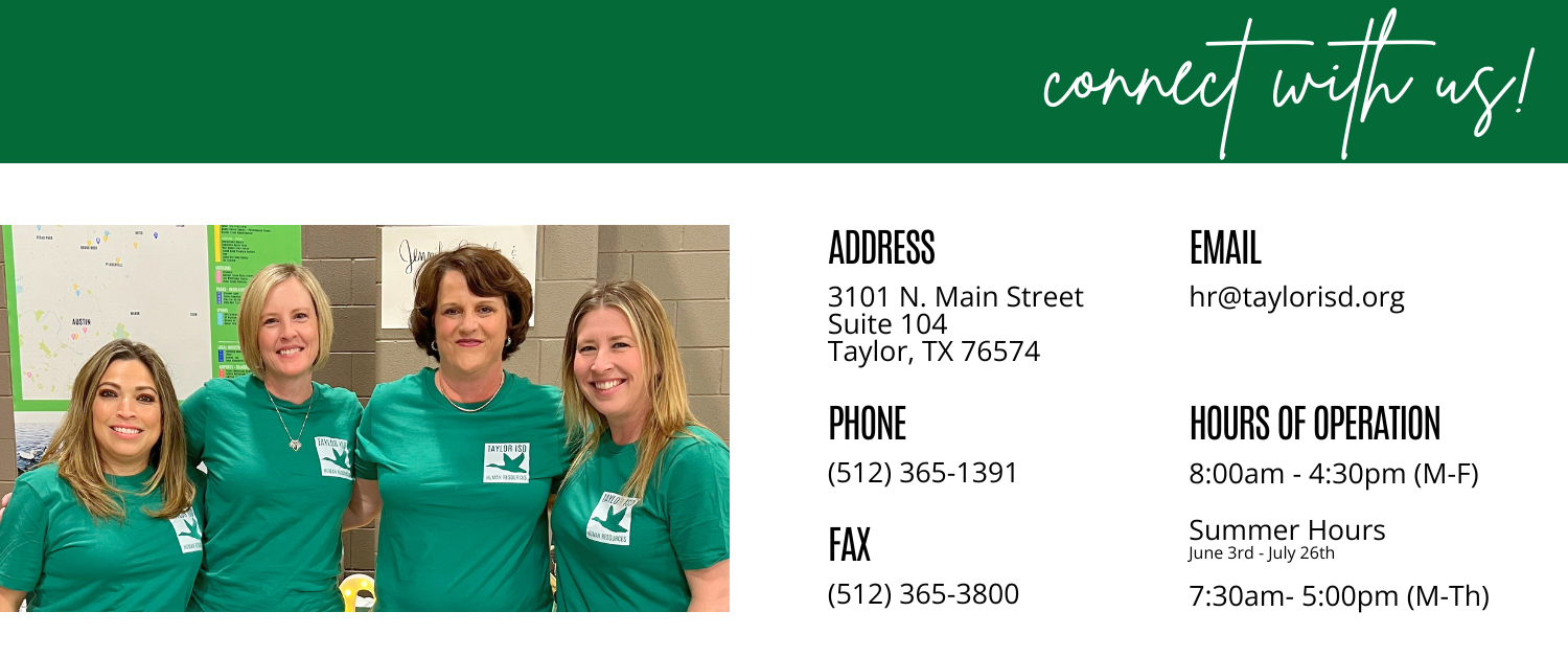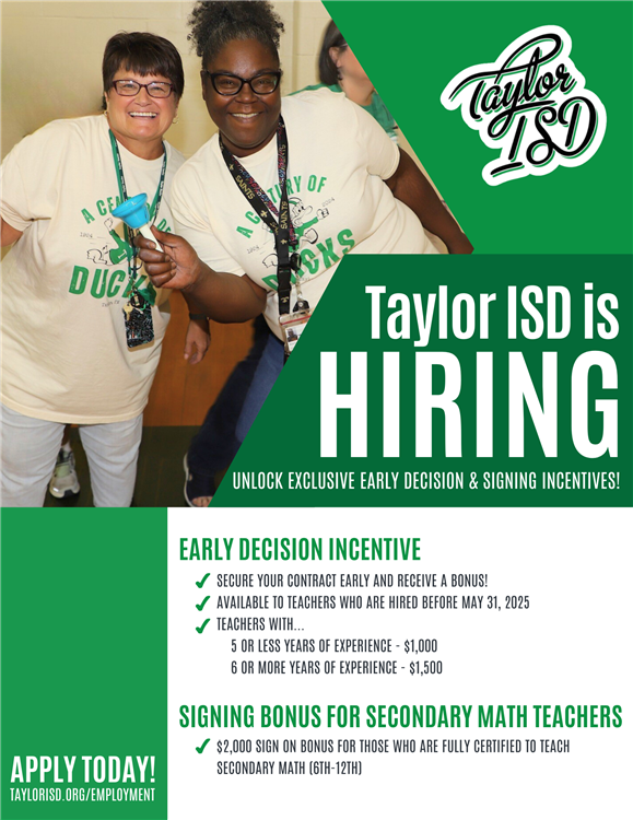 We are dedicated to recruiting and retaining the highest quality teachers and professionals to make Taylor ISD the district of choice. Our HR Department oversees recruiting and hiring, benefits, pay grades, substitutes, and employee processes.