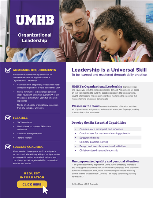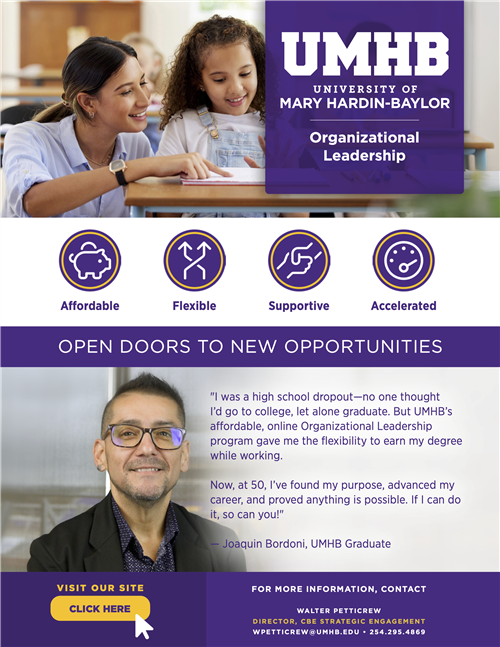 As we explore opportunities to support the growth and retention of our team, we’d like to introduce you to our partnership with the University of Mary Hardin-Baylor (UMHB). UMHB offers a flexible format with six, 7-week terms, allowing you to earn a bachelor's degree in Organizational Leadership. Upon enrolling, you will be paired with a success coach who will guide you throughout your journey until you complete your degree.