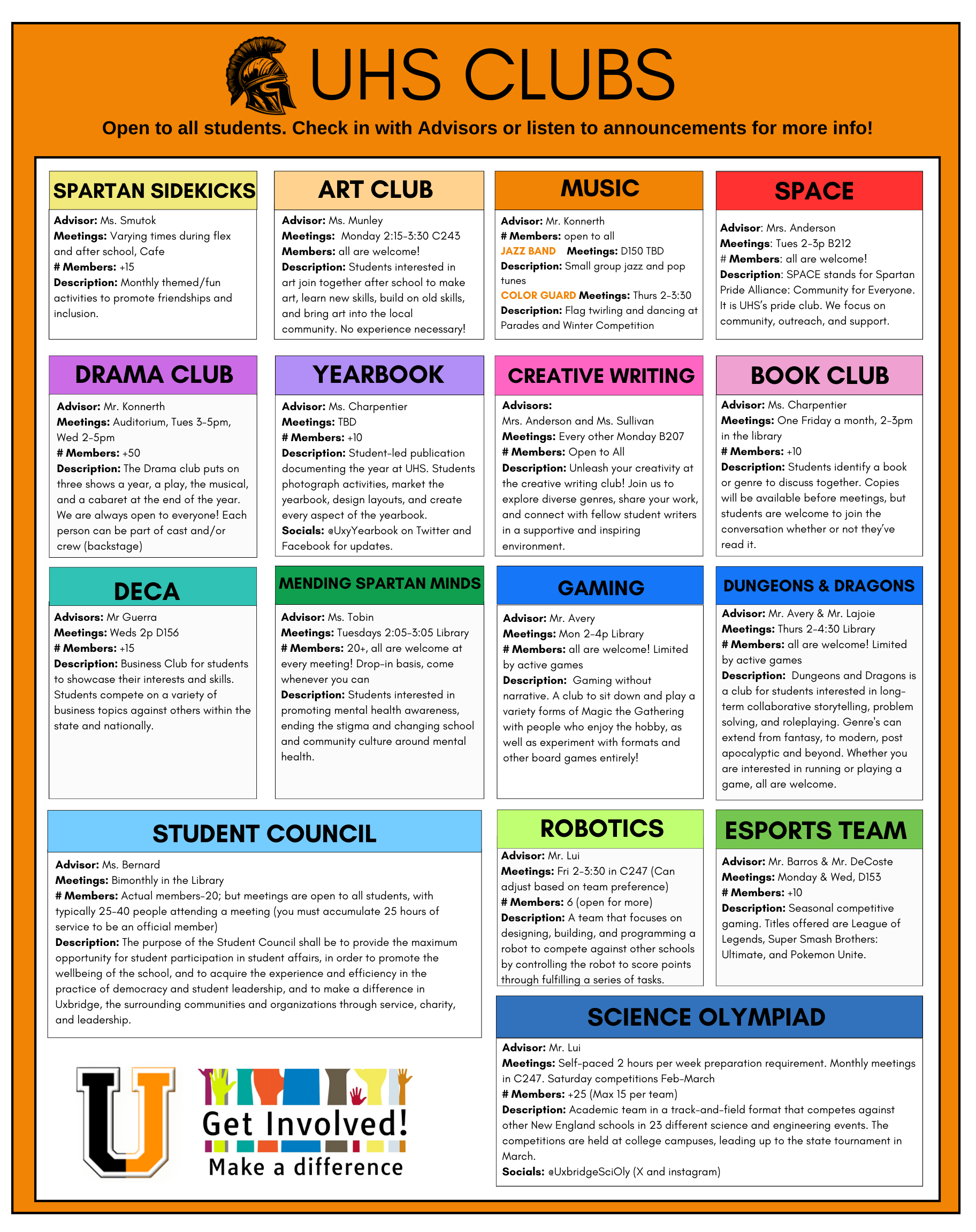 On Friday, our Student Council organized an activity fair that also included some class meetings, review of schoolwide expectations, and opportunities to connect with school counselors. It was also an opportunity for our students to get a sense of the different clubs and activities that exist at UHS, as well as to indicate interest. We also have had a number of meetings for organizations, and the contact information for the advisors is shared, in case families want to reach out about meeting dates and times: