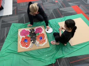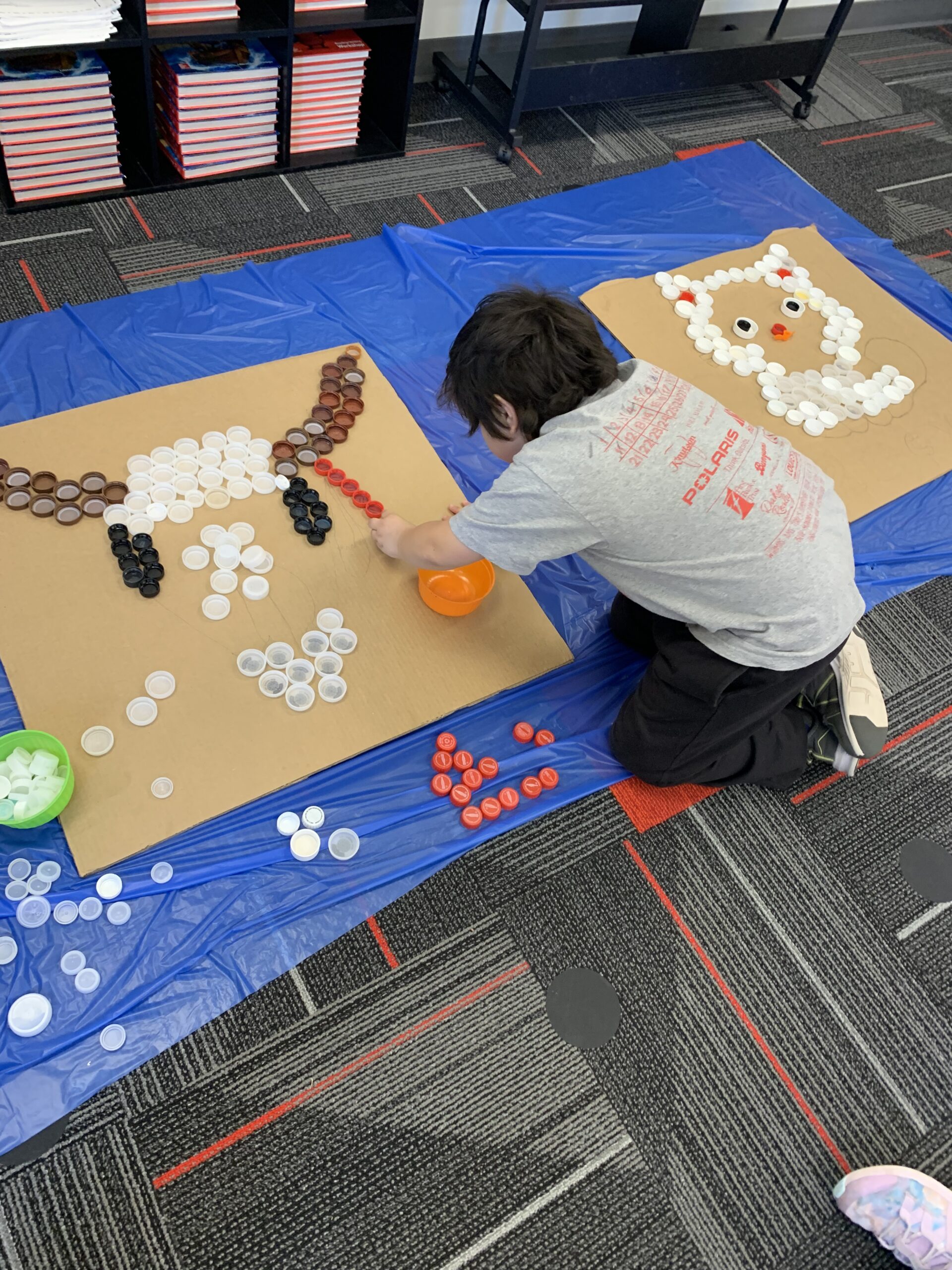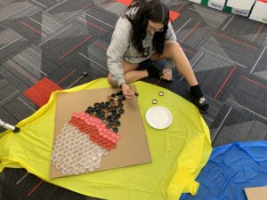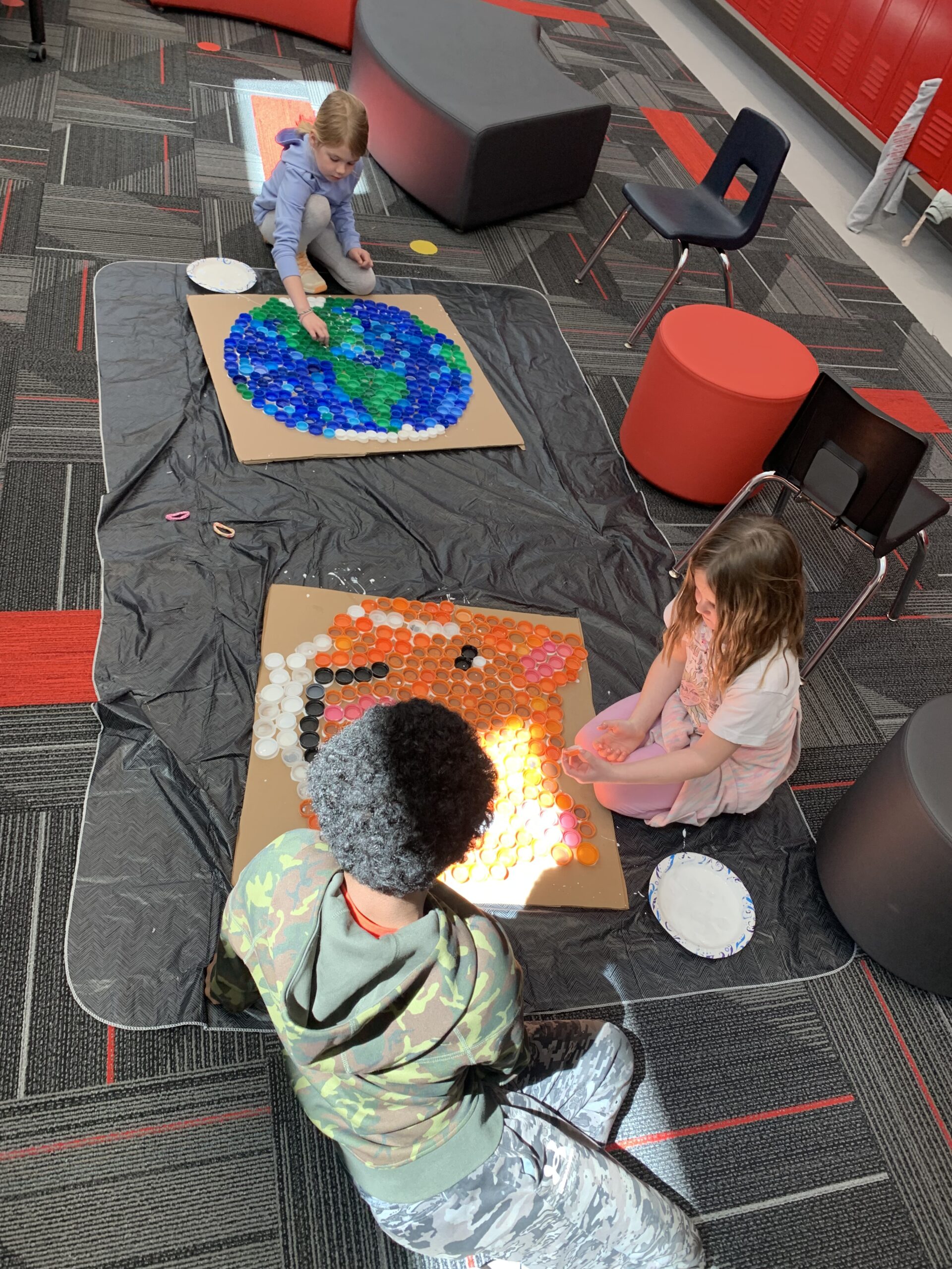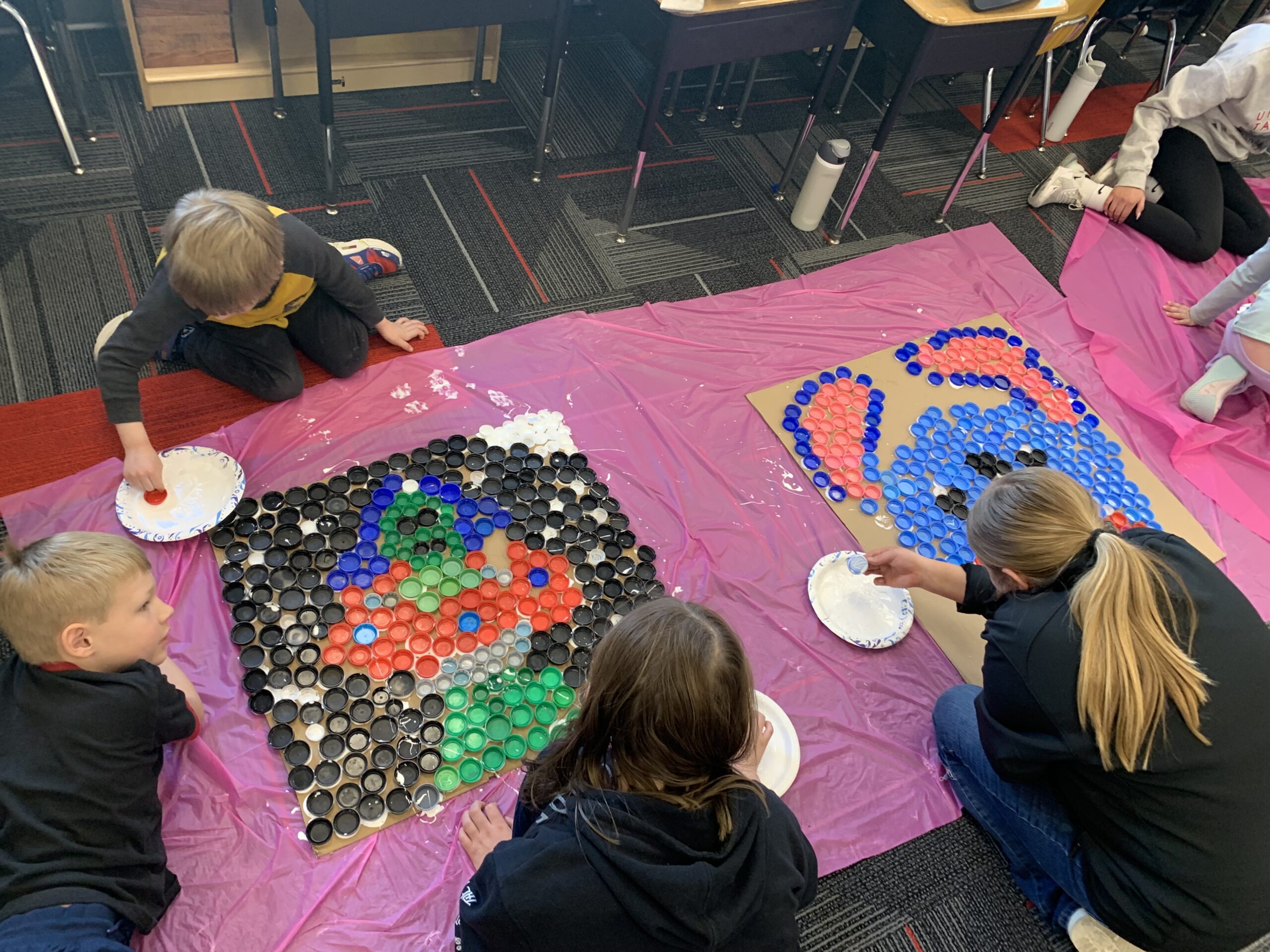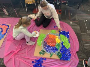 Mrs. Hage’s first grade class spent time on Thursday constructing mosaics from plastic lids, for their annual Earth Day art project. Students and many community members have been saving lids and contributing to the class collection throughout the school year to help the project be successful. Students were joined in the afternoon by middle school students in Mrs. Schwasinger’s class to help finish gluing the lids in place, as an extension of the district’s EnvisionED project. The mosaics, along with other Earth Day projects, will be on display at the Edith B. Siegrist Vermillion Public Library during the week of April 21-25.