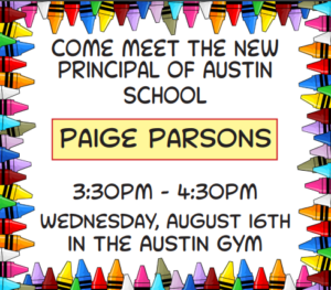 Come meet the new principal at Austin Elementary, Paige Parsons, on August 16th. The event will run from 3:30-4:30 pm at the Austin Elementary Gymnasium.