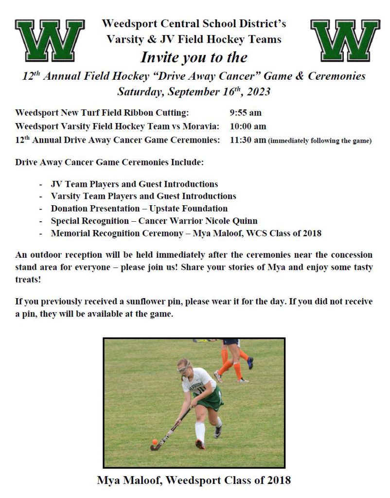 Posted on September 13, 2023September 13, 2023 by Heather.Schuss12th Annual Field Hockey “Drive Away Cancer” Game & Ceremonies Slated for September 16 Drive Away Cancer Game Flyer – PDF FacebookTwitterPrint