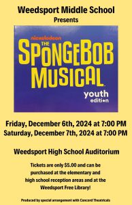 “SpongeBob the Musical – Youth Edition” will be performed on Friday, December 6th and Saturday, December 7th at 7:00 pm in the Weedsport High School Auditorium. Tickets are only $5.00 and can be purchased at the High School and Elementary School Reception Areas and at the Weedsport Library.