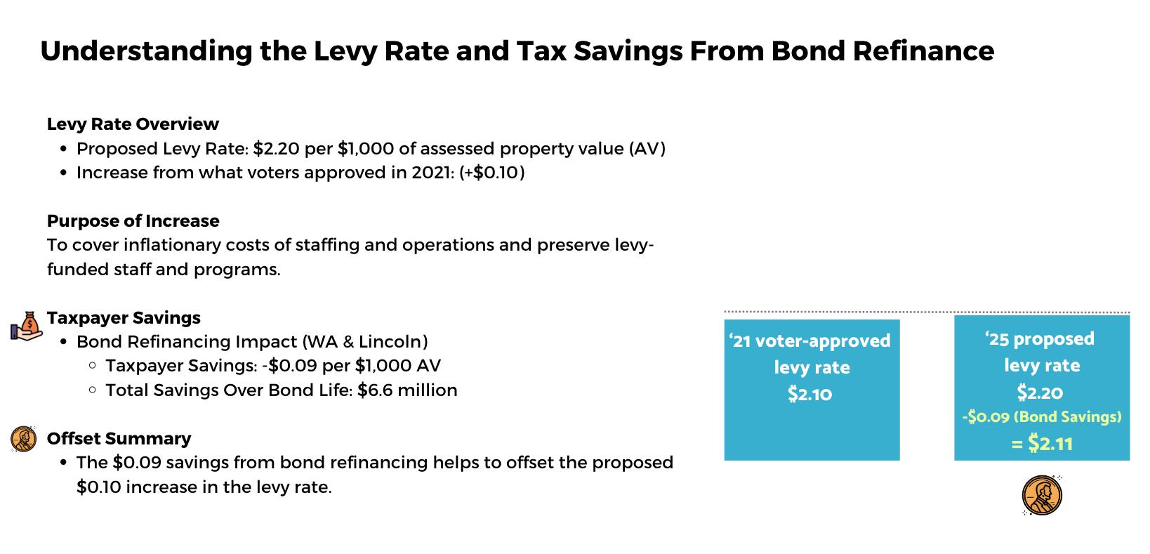 However, the district just refinanced bonds used for the construction of Washington and Lincoln Elementary Schools. Taxpayers are already paying for the bond along with the levy. This refinancing will result in tax savings of $0.09 per $1,000 of assessed value, effectively offsetting the proposed levy rate increase.