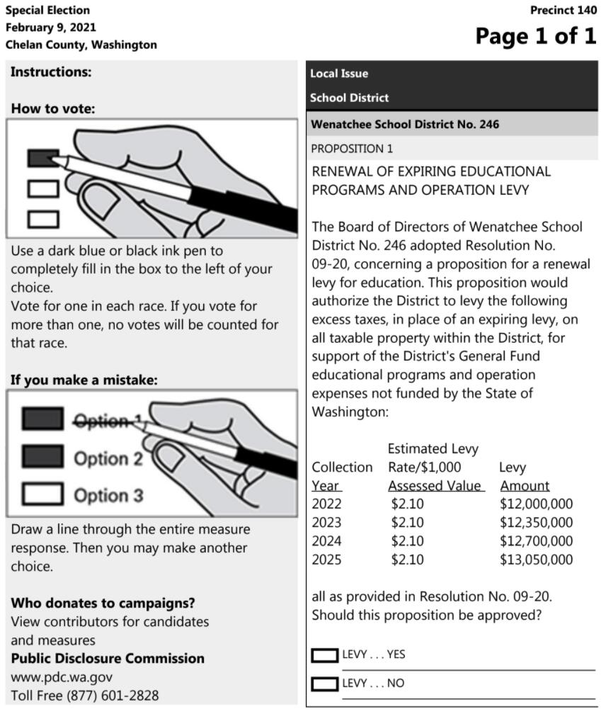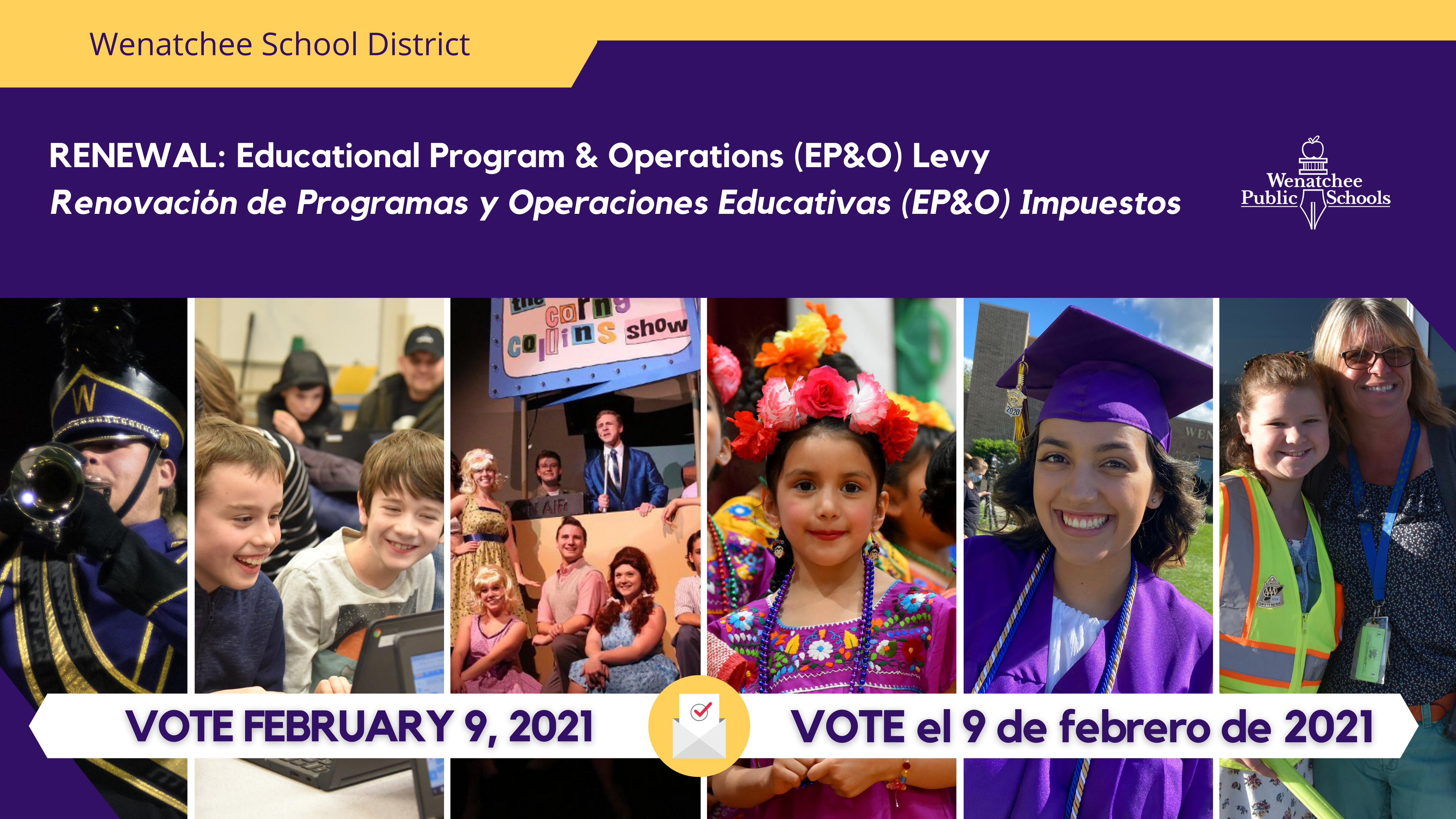 On Tuesday, February 9, 2021, Wenatchee School District residents will be asked to vote on a ballot item to renew our current four-year Educational Programs and Operations (EP&O) Levy. This levy is primarily for costs related to supporting core learning activities, technology, safety, and our ability to offer elective/specialist classes, field trips, and extracurricular programs such as art, drama, music, and sports.