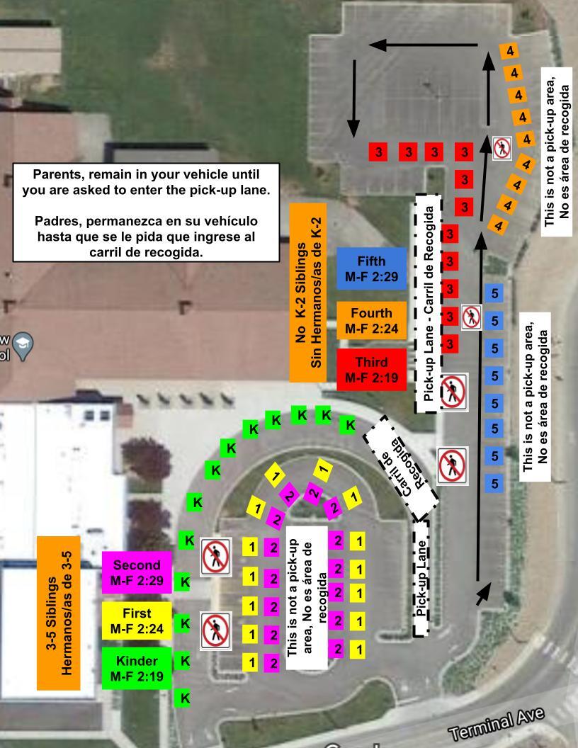 Los padres de niños de kindergarten ingresan primero al carril de recogida. Los padres de los grados 1 y 2 esperan en el estacionamiento superior. Esta no es una zona de recogida. Espere en su vehículo y se le indicará cuando pueda ingresar a la zona de recogida. Si va a recoger a varios estudiantes, venga cuando sea el tiempo de recoger al hermano/a mayor.
