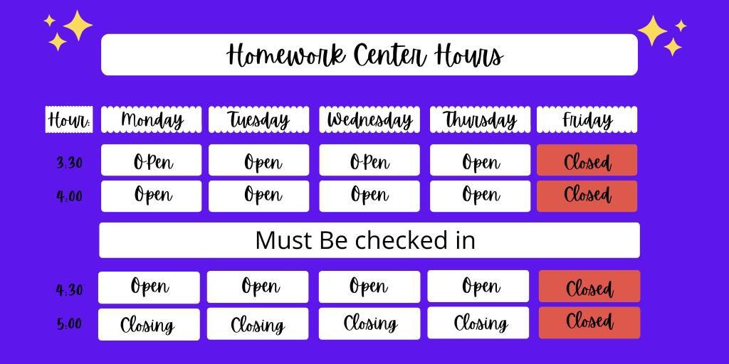 The Panther Homework Center is ran Monday- Thursday 3:30-5 pm. There are some days when the Panther Homework Center is on different hours or not running due to alternate schedules or weather, but those are few a far between but can be spur of the moment.