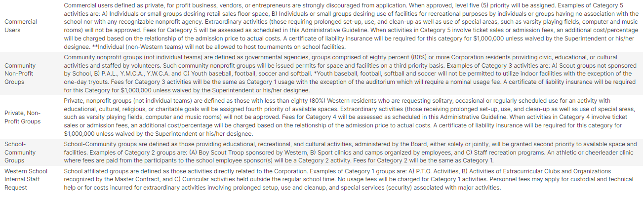 Commercial users defined as private, for profit business, vendors, or entrepreneurs are strongly discouraged from application. When approved, level five (5) priority will be assigned. Examples of Category 5 activities are: A) Individuals or small groups desiring retail sales floor space, B) Individuals or small groups desiring use of facilities for recreational purposes by individuals or groups having no association with the school nor with any recognizable nonprofit agency. Extraordinary activities (those requiring prolonged set-up, use, and clean-up as well as use of special areas, such as varsity playing fields, computer and music rooms) will not be approved. Fees for Category 5 will be assessed as scheduled in this Administrative Guideline. When activities in Category 5 involve ticket sales or admission fees, an additional cost/percentage will be charged based on the relationship of the admission price to actual costs. A certificate of liability insurance will be required for this category for $1,000,000 unless waived by the Superintendent or his/her designee. **Individual (non-Western teams) will not be allowed to host tournaments on school facilities. |