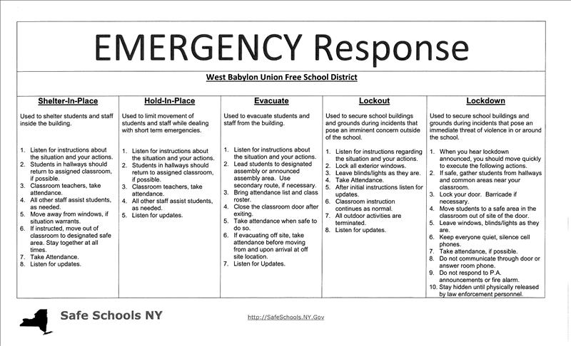 In recent years school safety has rapidly evolved. West Babylon schools are staffed with trained security guards and staff members who are trained and involved in our building emergency teams. These teams are prepared in the case of an emergency.