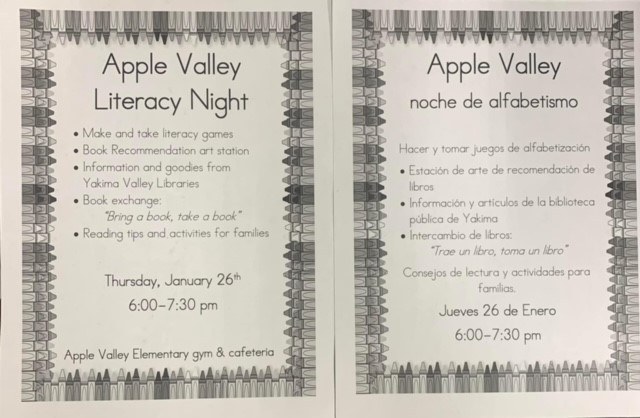 An wonderful evening of reading was recently spent at our Apple Valley Elementary where teacher Kristin Williams facilitated Literacy night. She’s been planning, coordinating, it for a couple of months and with the help of our leadership students, our families engaged in activities, games, a book swap, and conversations with our local Yakima Valley librarians who hosted a table.