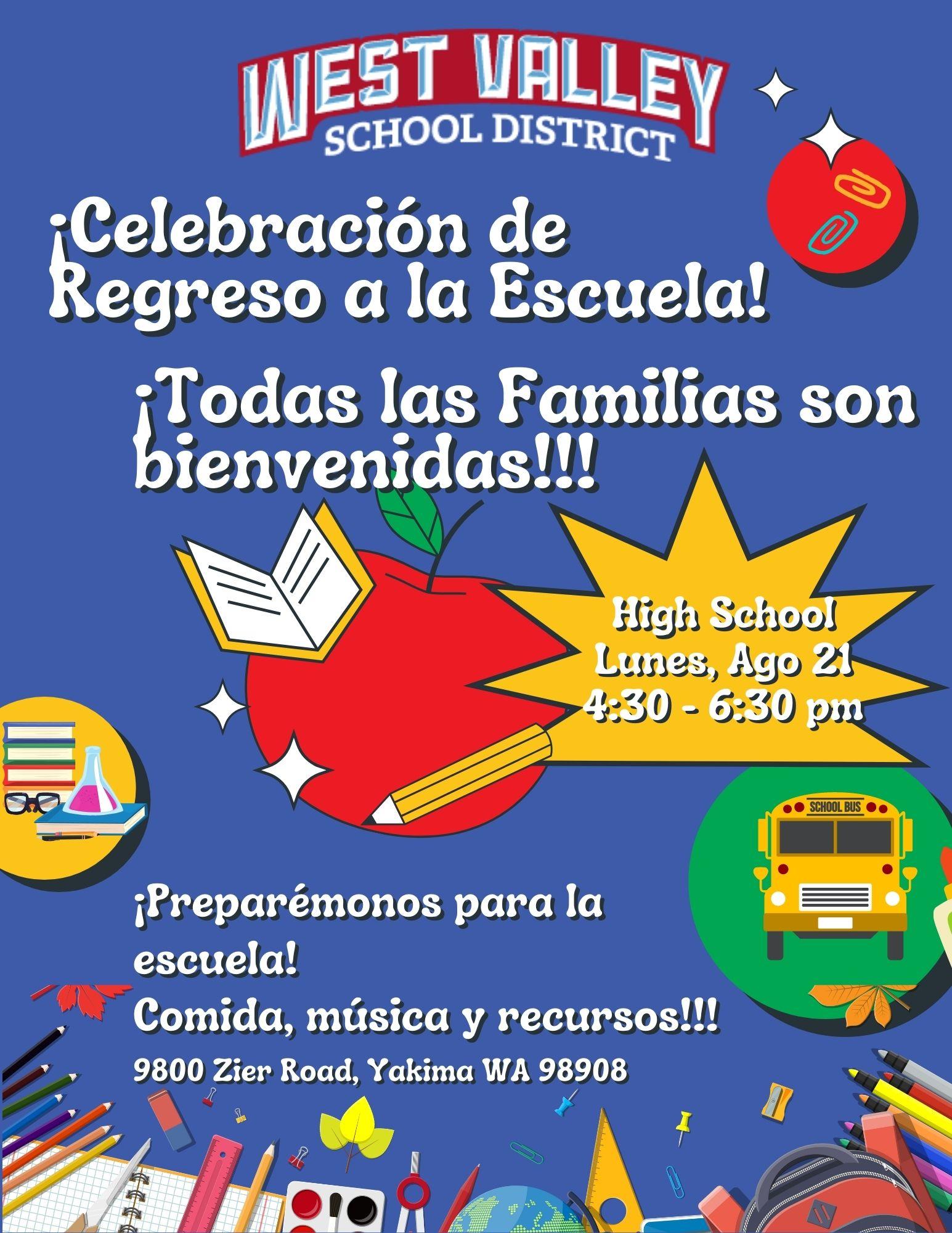 All West Valley students, families, and staff are invited to an All-District Welcome-Back celebration 4:30 pm - 6:30 pm on Monday, Aug. 21, 2023 in the WVHS Commons. The event will include food, music, and community resources for all ages. Join in the excitement and help us start this school year with plenty of smiles!
