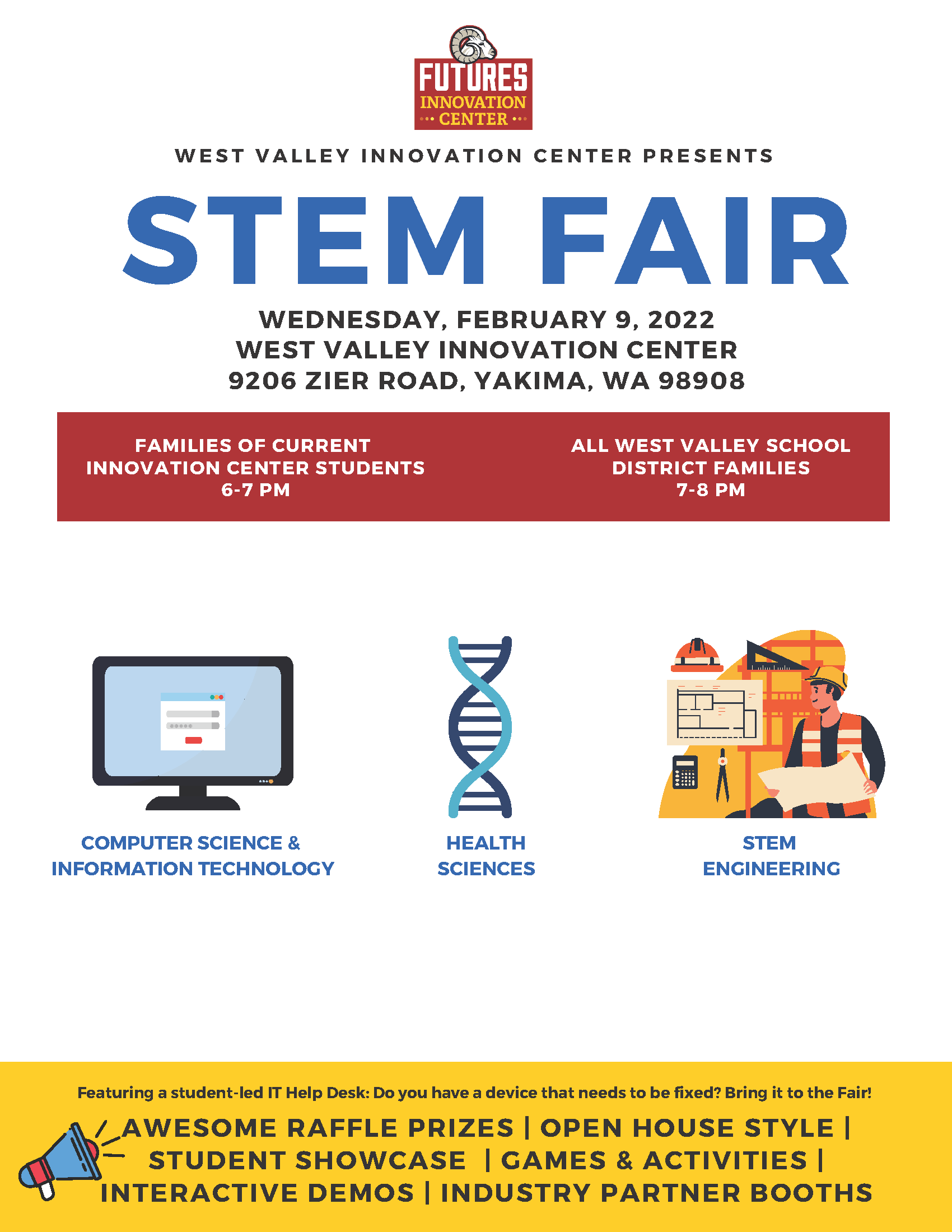 Come and enjoy the STEM FAIR on Wednesday, February 9, 2022, from 6pm-7pm for the families of current Innovation Center students, and from 7pm-8pm we hope all West Valley School District Families will be there.