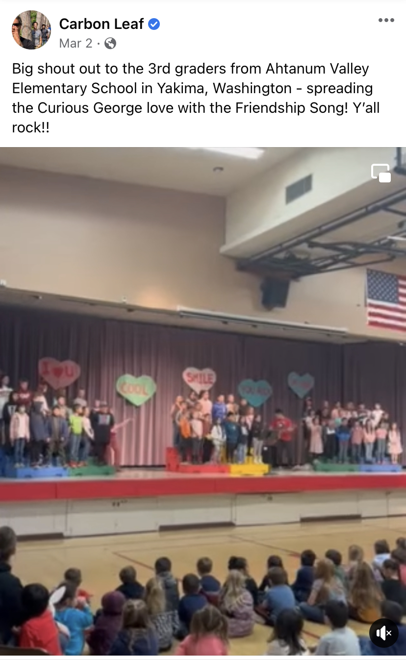So, that is precisely what they did. The response was even better than expected. After the show, Mr. Edgar sent a recording of their performance to the band Carbon Leaf and hoped for the best. Not long after he sent the musical performance video, Mr. Edgar got a response! The band Carbon Leaf asked if they could share the students performance on their band's social media page. Our Ahtanum Valley Elementary students couldn't have been more thrilled!