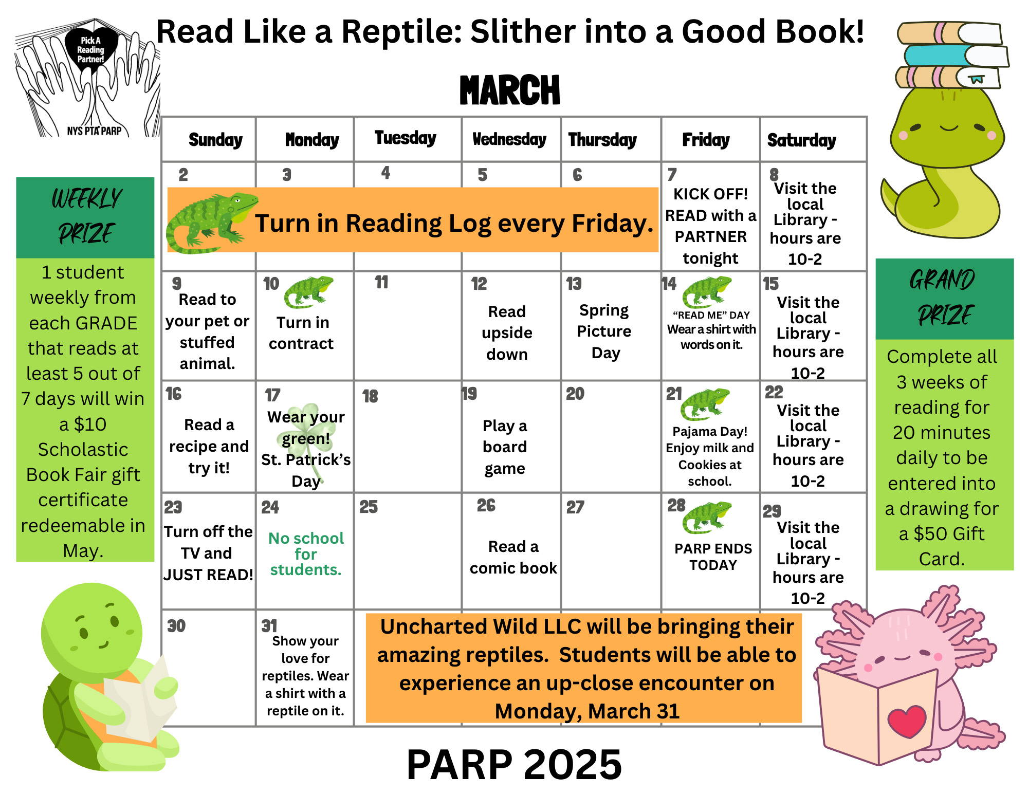 Whitehall Elementary is excited to launch this year’s Pick A Reading Partner (PARP) program, encouraging students and families to develop a love for reading! This year’s theme, “Read Like a Reptile: Slither into a Good Book,” reminds students that reading can happen anywhere—whether it’s a book, a recipe, a magazine, or even a cereal box!