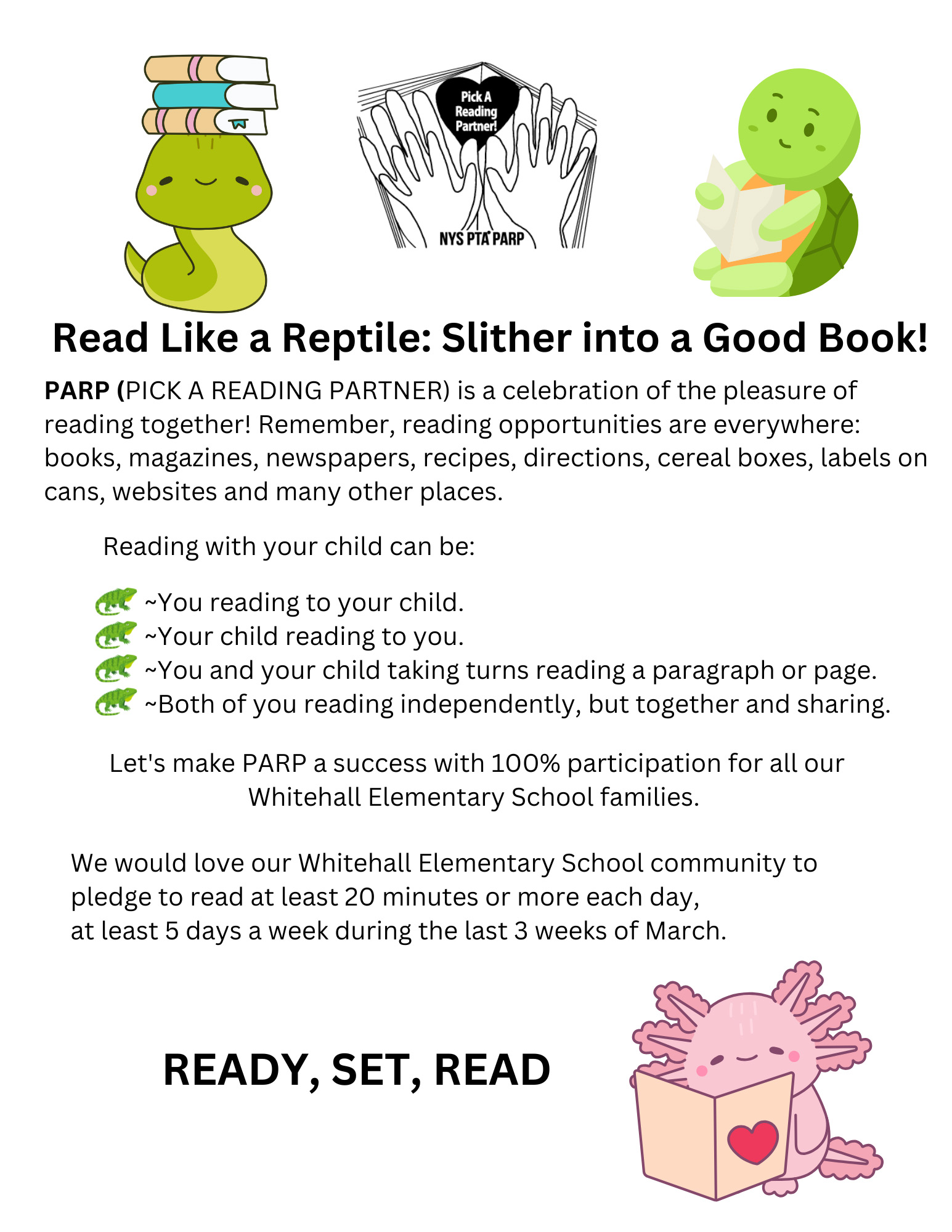 We invite all Whitehall Elementary families to take part in this exciting program and help us make reading a daily habit. Let’s slither into some great books and make this the best PARP yet!